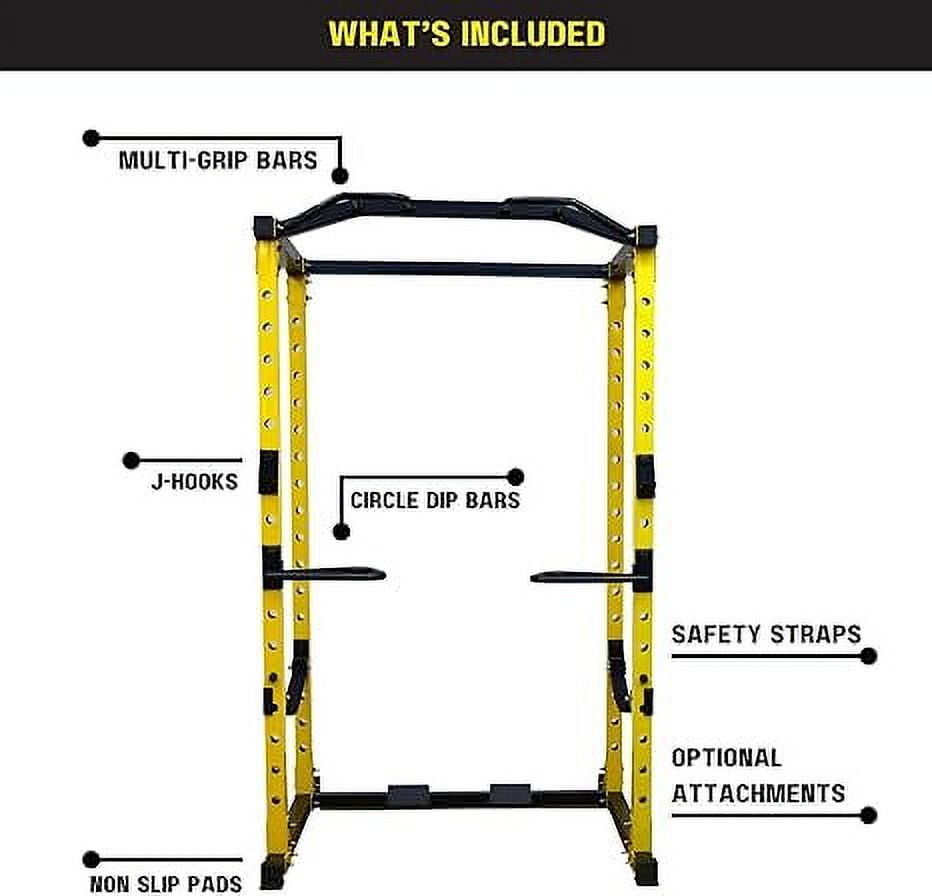 HulkFit Pro Series Multi-Functional Adjustable Home Gym Exercise Equipment Power Cage with J-Hooks, Safety Bars or Safety Straps, Yellow