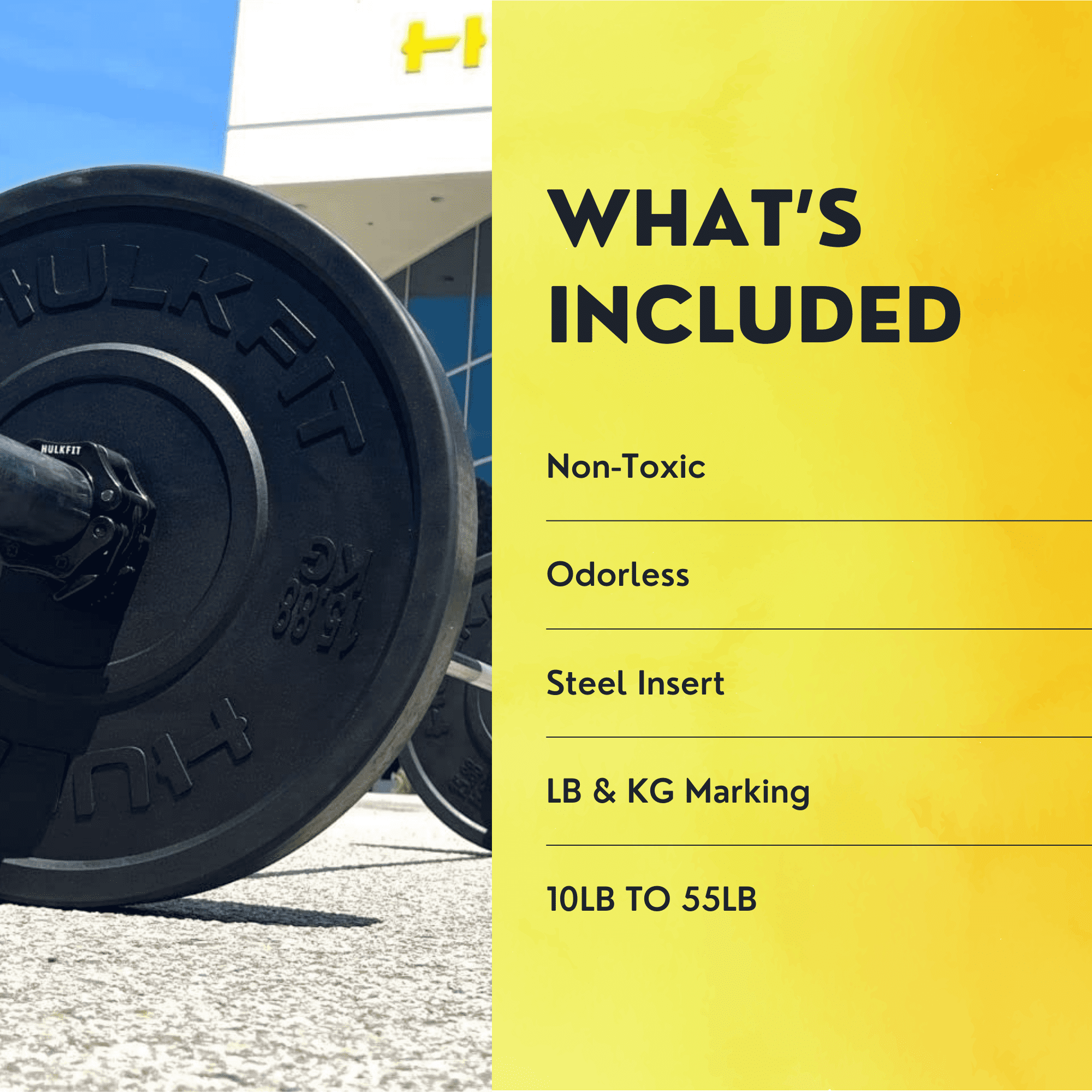 $77.39Elevate your home gym, garage gym, or athletic training with the HulkFit 2-Inch Sport Series Olympic Bumper Plates. These versatile weight plates are built for serious strength training, offering durability, protection, and versatility.Key Features:Eco-Friendly Construction: Made with a blend of virgin and recycled high-density rubber, these bumper plates are gentle on floors and the environment.Universal Compatibility: Designed with a 2-inch diameter stainless steel insert, the HulkFit plates fit seamlessly on all Olympic barbells (2-inch diameter or less). The bumper plates set (each sold separately) feature 17.75-inch diameter.Clear Weight Identification: Dual weight markings in pounds (lbs) and kilograms (kg) ensure you can easily select the right weight for your workout.Enhanced Grip: The raised edge design provides a secure hold for weight plate exercises (without barbells).Reduced Bounce: The high-density rubber construction minimizes bounce after drops, protecting your equipment and minimizing noise.Perfect for a Variety of Exercises:Strength Training: Bench press, squats, lunges, deadlifts, and more.Olympic Weightlifting: Cleans, snatches, jerks.Bodybuilding: Build muscle mass and definition.Martial Arts: Enhance power and explosiveness.Pair Up for a Complete Workout:These HulkFit bumper plates are compatible with a wide range of HulkFit equipment, including barbells, dumbbells, kettlebells, and weight storage racks (all sold separately).Invest in your health and fitness with the HulkFit 2-Inch Sport Series Olympic Bumper Plates!SpecificationsCollar diameter – 2”Weight Plate diameter – 17.75″*** NOTE – 10 lb plates and 15 lb plates are NOT designed to be used ALONE. The 10 lb and 15 lb weight plates are thinner and are meant to be used in conjunction with the larger weight plates to prevent bending on the 10 and 15 lb plates. Otherwise, you may incur damage if used alone. ***