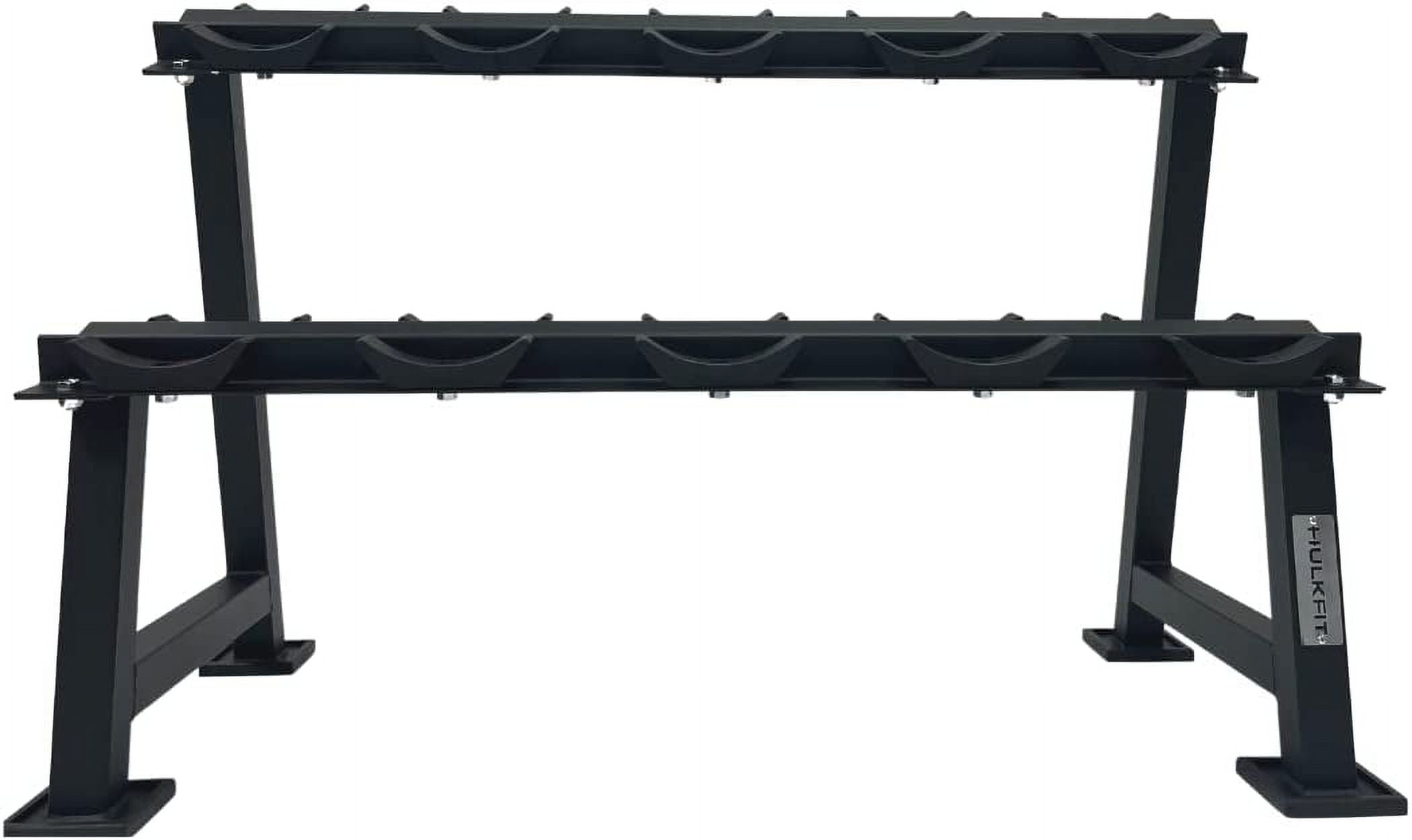 $107.50Hulkfit 2 Tier Adjustable Weight Storage Rack is built from hardy 2mm thick powder coated steel and features 10 high density plastic cups that are removable. Load and unload your weights with relative ease with the ergonomic, angled design of the top tier. We angled it to help identify weights much more quickly during timed workout sessions and for biomechanical purposes. This means we shaped the unit to work with the contours of the human body to lift the weights in a more natural way. The shock absorbing feet will help stabilize the rack and provide a cushion between the unit and the floor. We recommend placing lower weighted circular dumbbells on the cups and removing the cups for dumbbells weighing more than 30 lbs. Dumbbells that weigh more than 30 lbs should be racked on the bottom tier. We do not recommend storing hex shaped dumbbells on the cups because they will lie flat naturally. With the cups removed, there will be more space to store chalk or other accessories like our clamp collars. We recommend adding our 8mm Rubber Gym Mats as support and to maximize the protection of your floor.