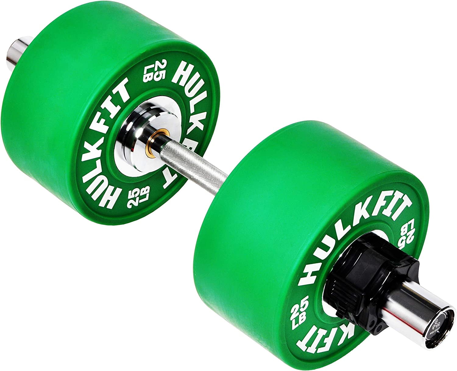 $54.13*** IMPORTANT – Dumbbell Bumpers are NOT meant to be dropped from overhead ****** IMPORTANT – 10 pounds plates are NOT designed to be used ALONE. To make all plates in same diameter, 10 pounds plates are thin, so they will bend if you use them alone. This will damage your 10 pounds plates ***Overview: HulkFit Dumbbell bumper plates are designed with 2″ diameter, but much more compact than regular Olympic bumper plates. High Density rubber plates with solid stainless steel insert can withstand repeated uses. They will not only protect any type of floors, but also protect your bars. Color coded based for easy identification. Plate Dimensions: Inner ring diameter: 2-inch. Total diameter: 9-inch. Thickness: 1. 25″, 4. 7″, 5. 9″ and 5. 9″ for 10lbs, 25lbs and 35lbsHandle Dimensions: Bar length: 25-inchSleeve length: -inch Weight: 13-poundsBoth plate and Handle Sold as single (NOT a pair) – 10 Pounds, 25 Pounds, 35 Pounds, 45 Pounds. AT A GLANCE (Plate): – 2″ inner ring diameter- Total diameter: 9″- High density rubber plates- Solid stainless steel insert- Sold as single AT A GLANCE (Handle): – Solid steel- 25-inch long- 2″ bar end diameter- Knurling position- Rotating sleeves- Sold as single