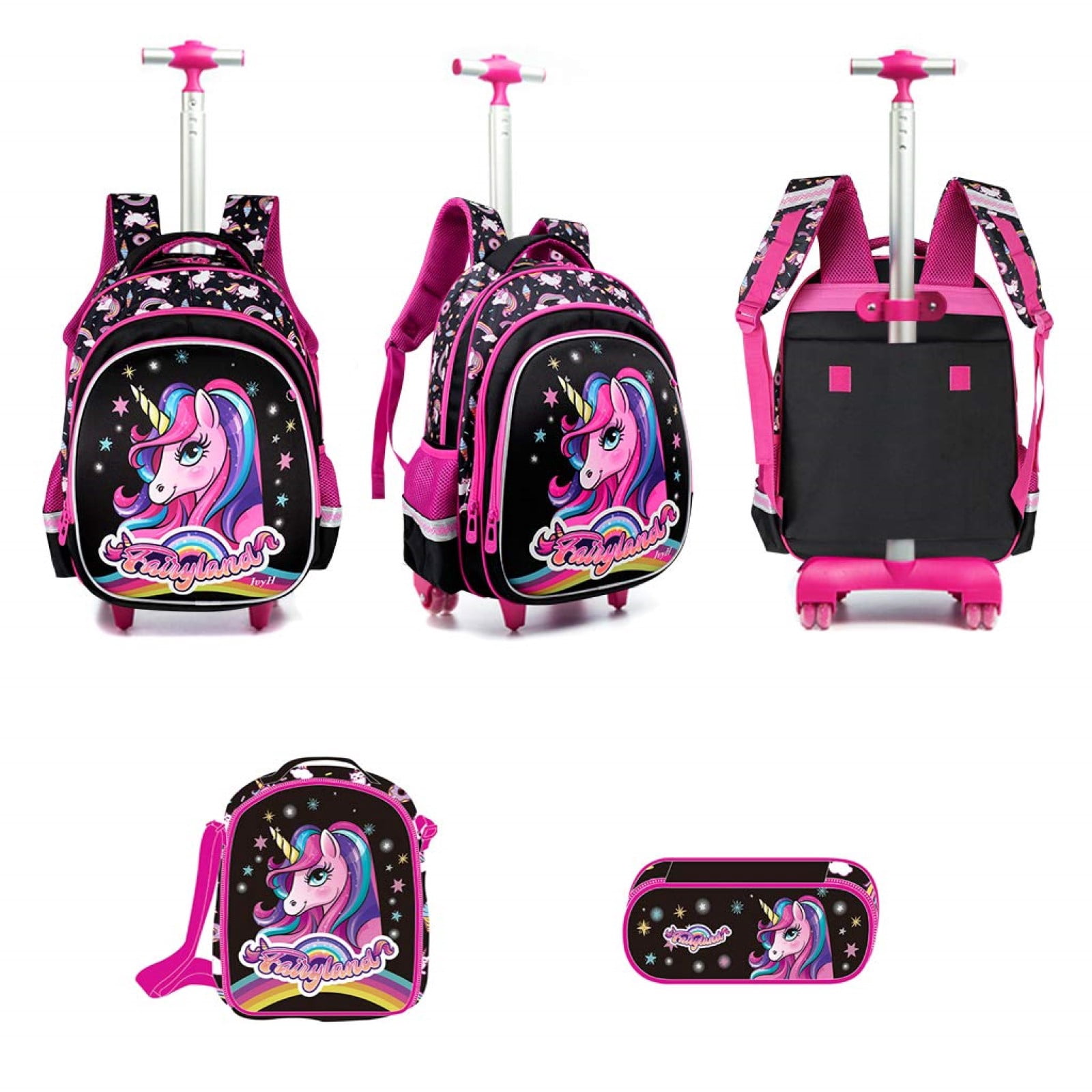 IvyH 3PCS Rolling Backpack Wheeled Bag with Lunch Bag and Pencil Case,Black Unicorn