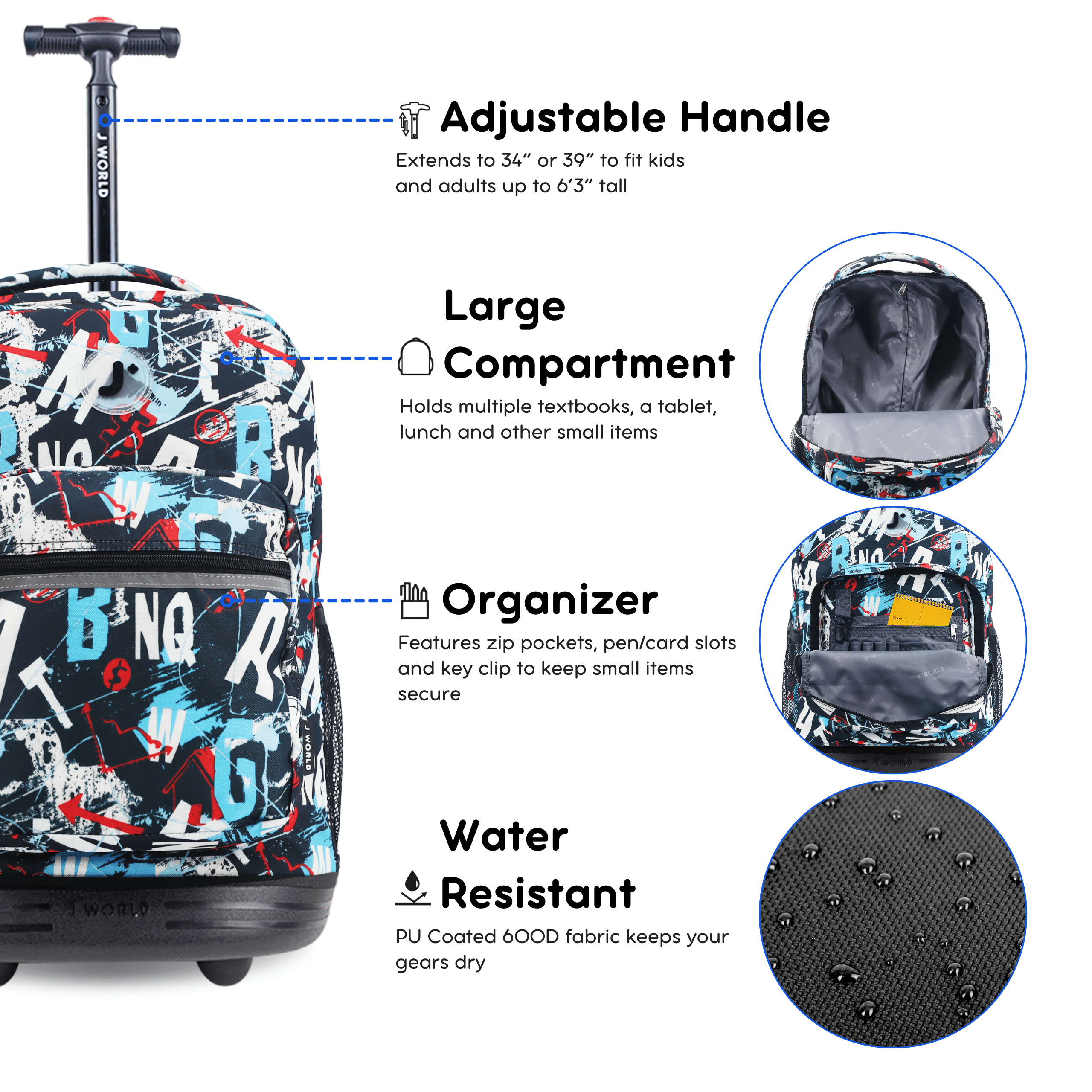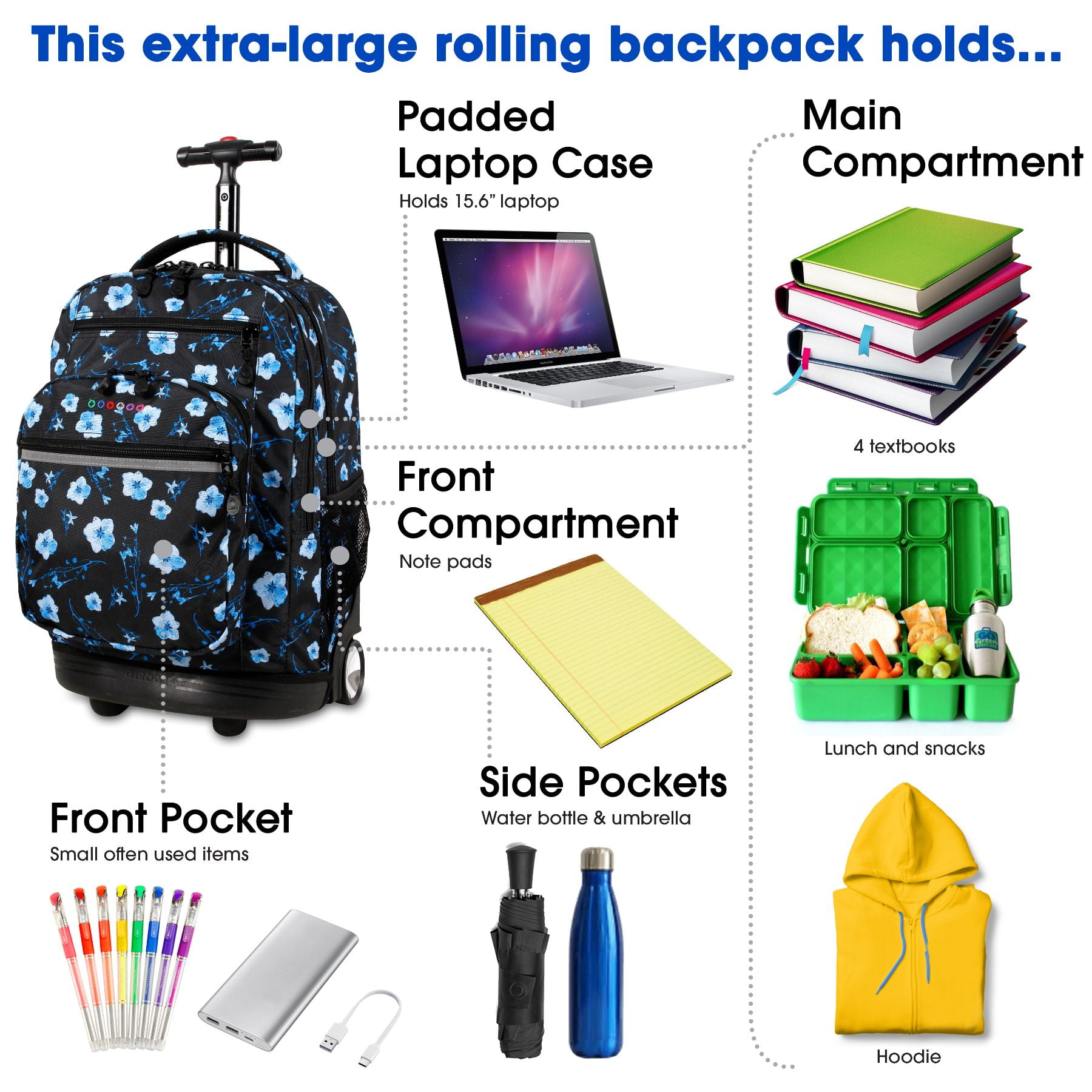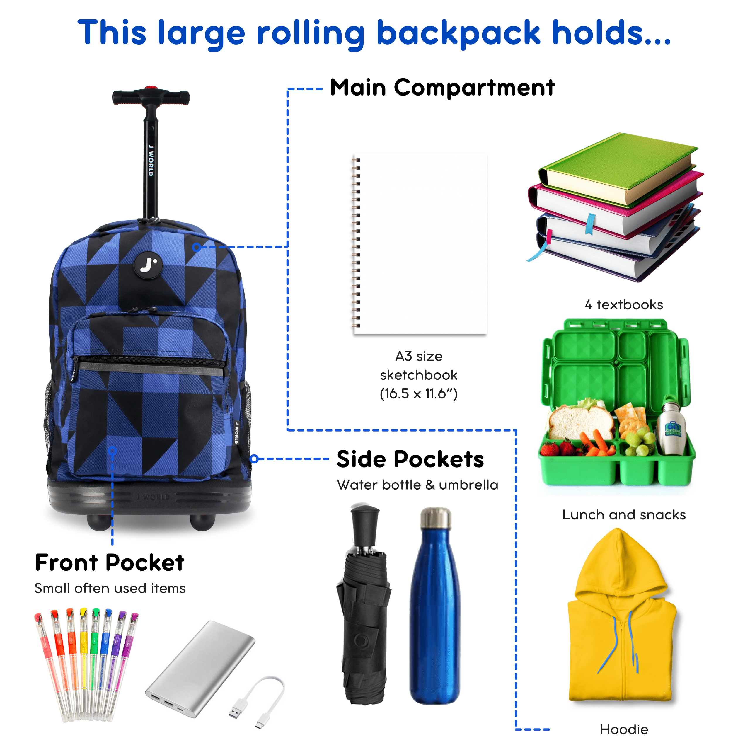 $34.39Lighter rolling backpack with all the essential features! Sunny rolling backpack is lightweight, smaller version of Sunrise rolling Backpack. The backpack features all the essentials that J World Rolling Backpacks have at more economical price point.