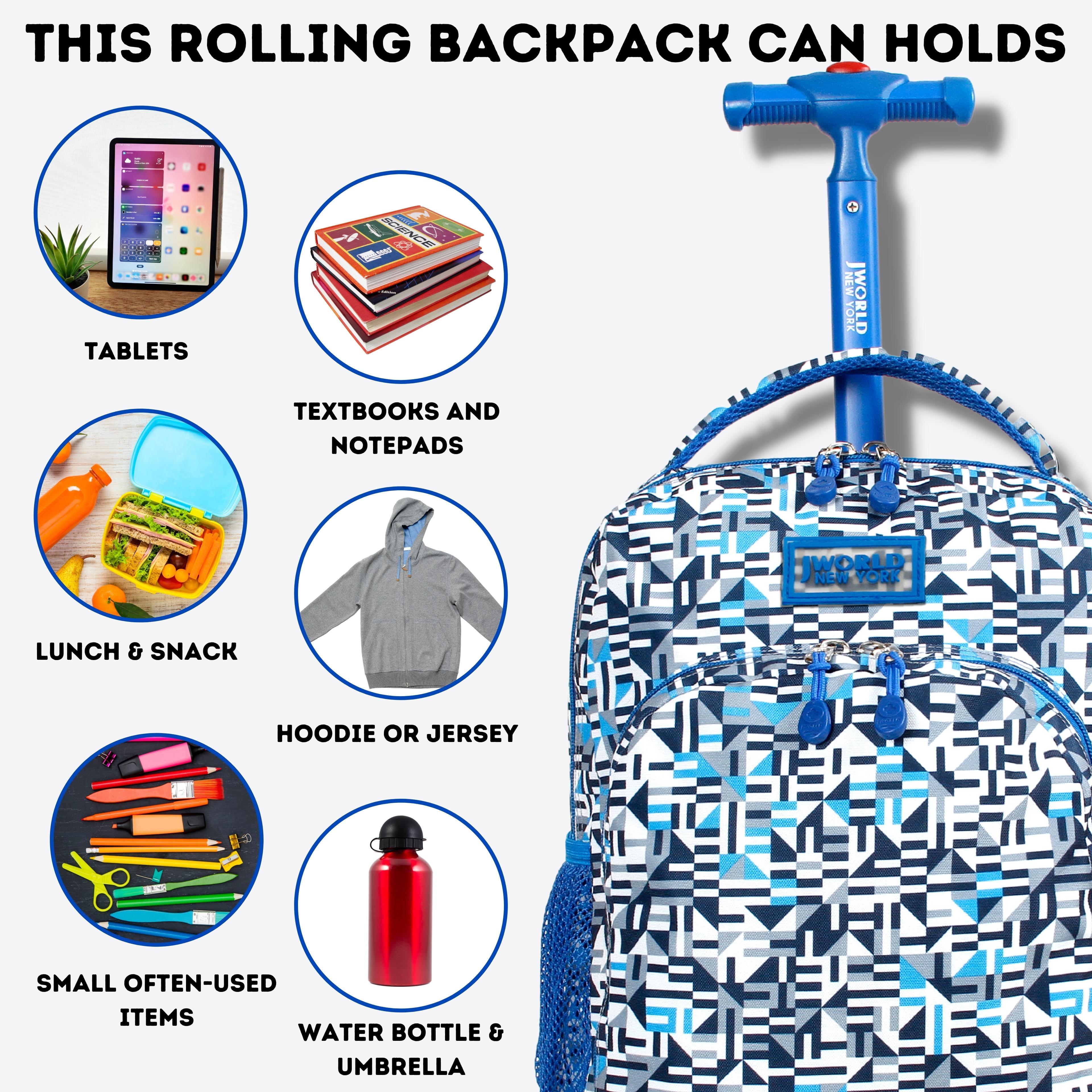 J World Boys and Girls Sunny 17″ Kids Rolling Backpack for School and Travel, Geo Blue