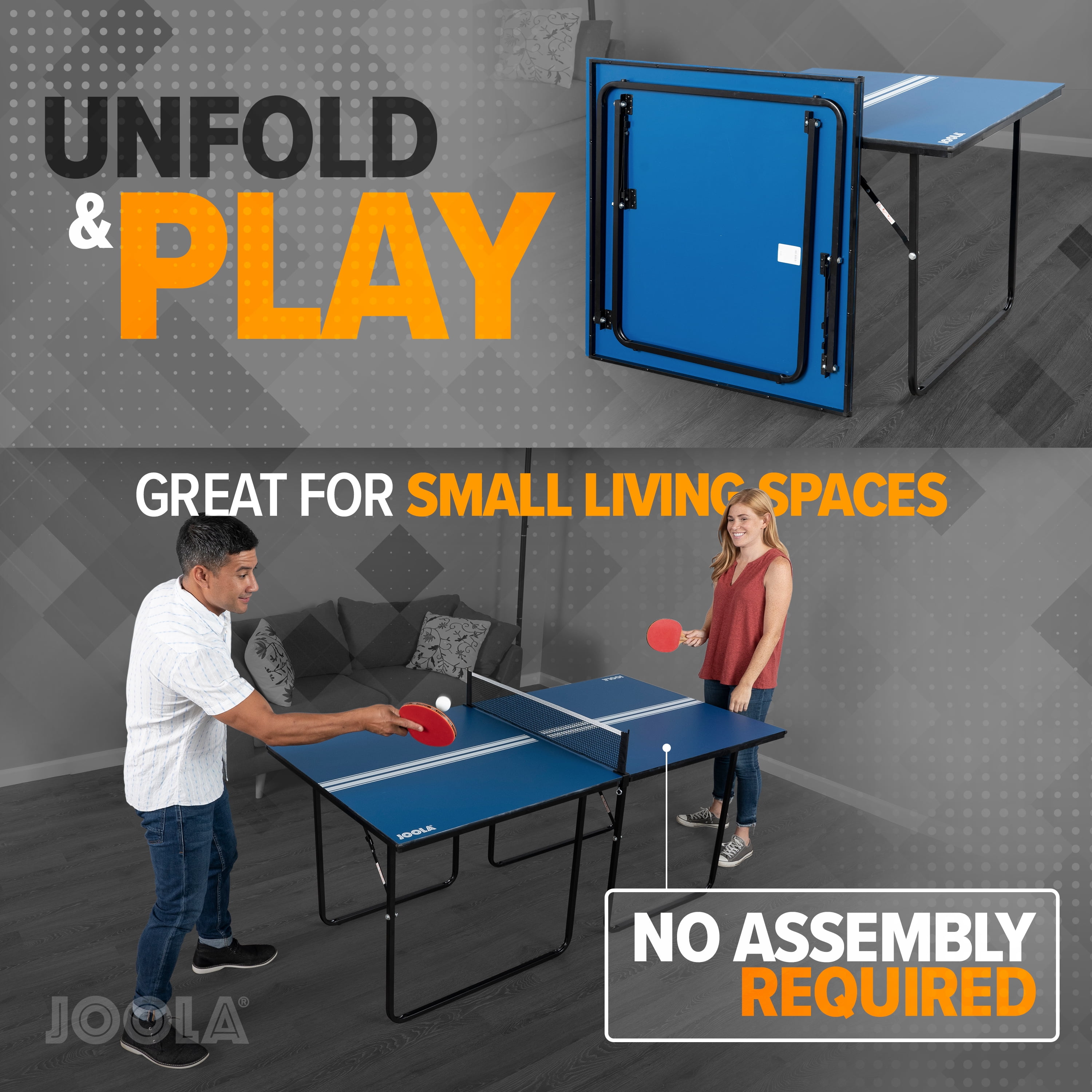 $171.14Original price was: $171.14.$111.79Current price is: $111.79.The JOOLA Allegro midsize ping pong table is perfect for anyone who loves table tennis but is tight on space. The table stands at regulation table tennis height (30 inches) with a surface that is two-thirds (72 inches) the size of a regulation-sized ping pong table. The table thickness is 12mm. Each half of the table is a near-perfect square and can stand alone, perfect for card, poker, casino games, or any of your other multi-use table needs. With the JOOLA Allegro midsize table tennis table, you can enjoy a game of indoor table tennis no matter the space you have. The foldable halves can be stored in most standard-sized closets, so after playing you can reserve space when needed. The JOOLA Allegro blue midsize Table requires no assembly. Simply unfold each half’s legs, attach the ping pong net and you’re ready to play. Start playing like a champion with equipment developed for champions.