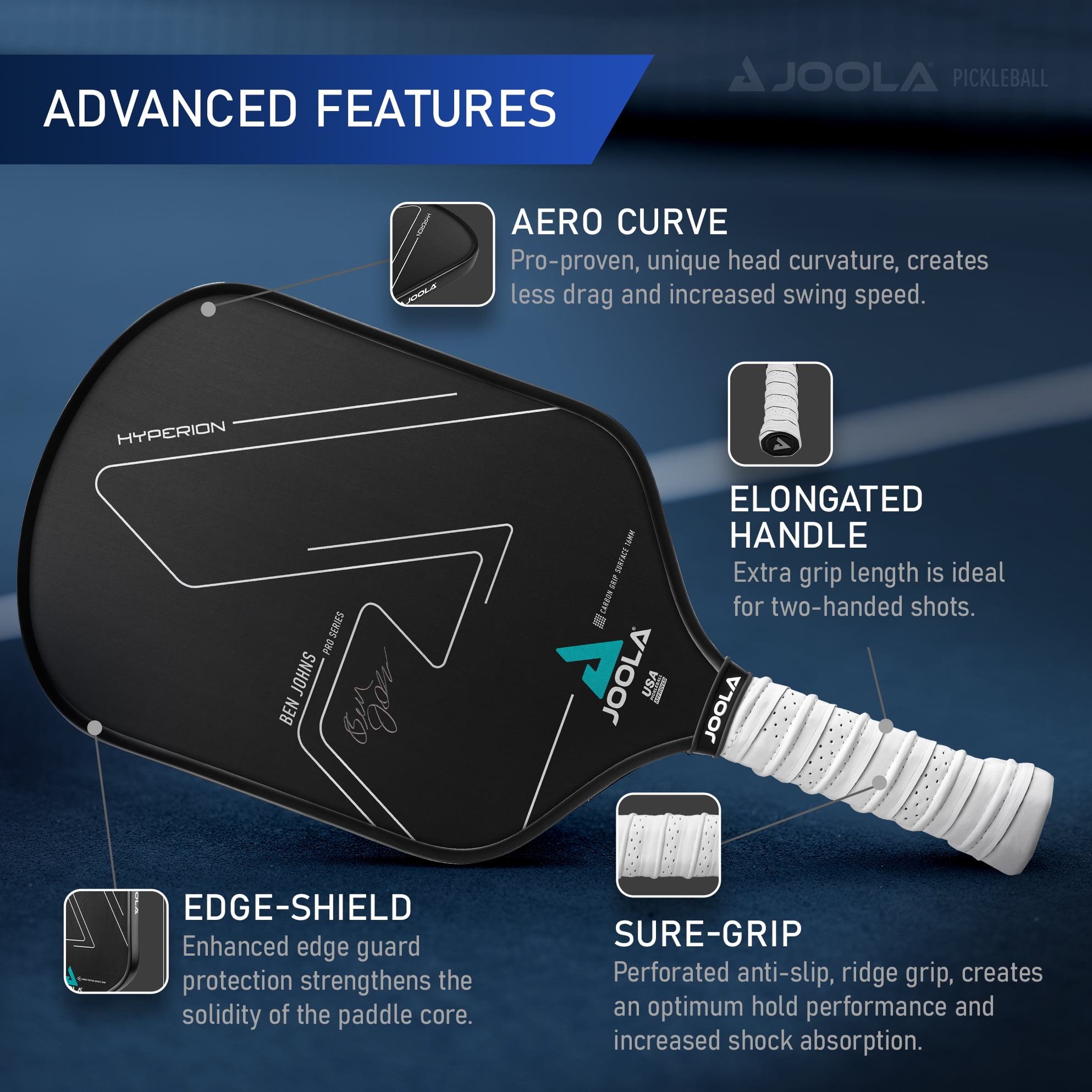 $137.56The JOOLA Ben Johns Hyperion CAS 16MM features a more aggressive shape that offers an ideal amount of control and versatility on different types of shots. The Joola Ben Johns Hyperion CAS 16 Pickleball Paddle delivers innovative technology designed to enhance play of those looking for optimal control and touch. This paddle offers Hybrid-Ply Technology, a strategic layering process that combines multiple materials to offer outstanding control and feel. The top layer is constructed to improve dinks and blocking while the bottom layers cater to more powerful drives. Its Carbon Abrasion Surface utilizes a sand-blasting process to create a unique textured surface for enhanced spin while the Response Polymer Honeycomb Core adds durability and performance. USAPA-approved for competition.