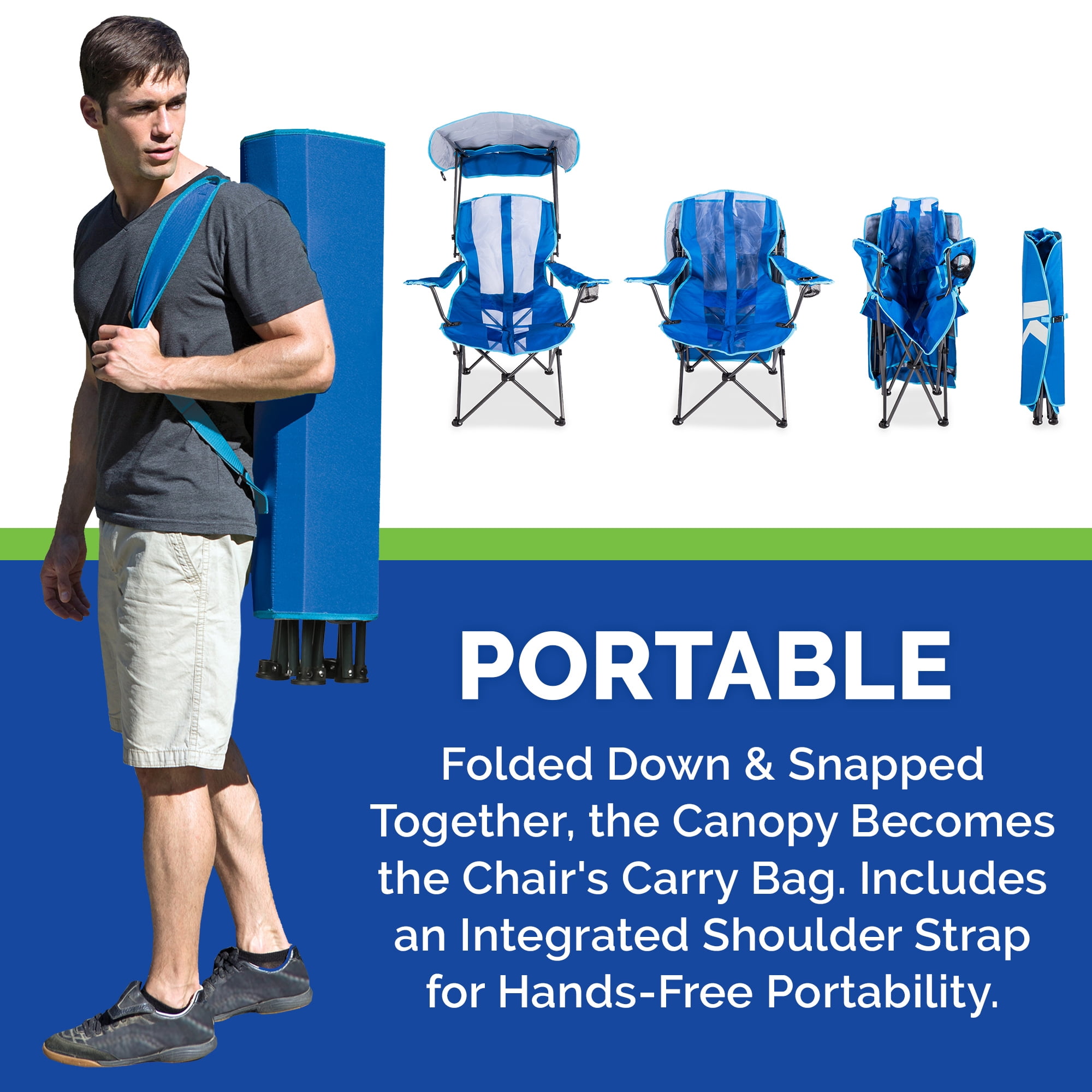 Kelsyus Premium Portable Camping Folding Outdoor Lawn Chair w/ 50+ UPF Canopy, Cup Holder, & Carry Strap, Blue & Gray