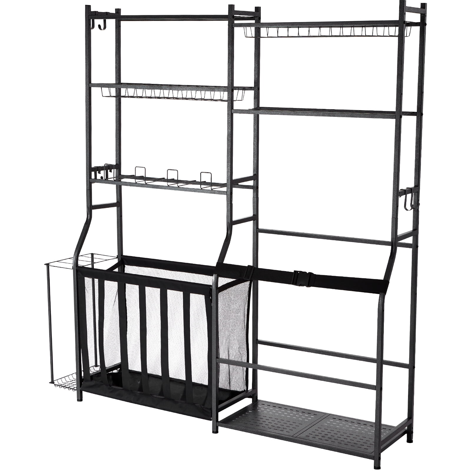 $77.39Product Description Multifunctional Sports Equipment Garage Organizer Dedicated to providing sports enthusiasts with storage solutions for their equipment, aiming to achieve an effortless indoor and outdoor organizing experience. Ideal for every physical trainer, professional coach, and anyone organizing sports equipment, offering the best solutions. Multifunctional This sports garage organizer comes with a variety of accessories. All these storage accessories help to keep your sports equipment organized, ensuring your items are neatly arranged and truly saving space. Humanized Design The detachable hooks expand the storage space and options; the added side rack allows for easy placement of various rackets and bats. Elastic bands maximize the use of the ball storage box’s space. The sports storage cart features six adjustable feet for easy height adjustment. Sturdy and Durable Material This sports gear storage organizer is made from heavy-duty powder-coated steel frames and heavy metal wire mesh, durable and wear-resistant for many years of use. Scratch-resistant textured paint, waterproof, rustproof, and resistant to scratches, ensuring a longer-lasting storage solution. Suitable for More Settings This practical sports equipment is perfect for organizing items in gyms, schools, and any sports venues, easily keeping your space tidy and organized. Easy to Install Its simple structure and instructions make this garage toy storage organizer easy to install, with all necessary accessories included, offering straightforward and efficient assembly. Adjustable Feet Featuring adjustable feet for easy height adjustment. Fixed style are more stable. Keep the storage cart safe, and balance even on uneven surfaces, allowing you to fully enjoy the joy of exercise. Specifications Item Model Number: RF-RY-032 Main Material: Q235 Product Weight: 13.8 kg / 30.42 lbs Product Dimensions (LxWxH): 1575x330x1677 mm / 62x13x66 inches Package Content 1 x Sports Equipment Garage Organizer 1 x Set of Accessories