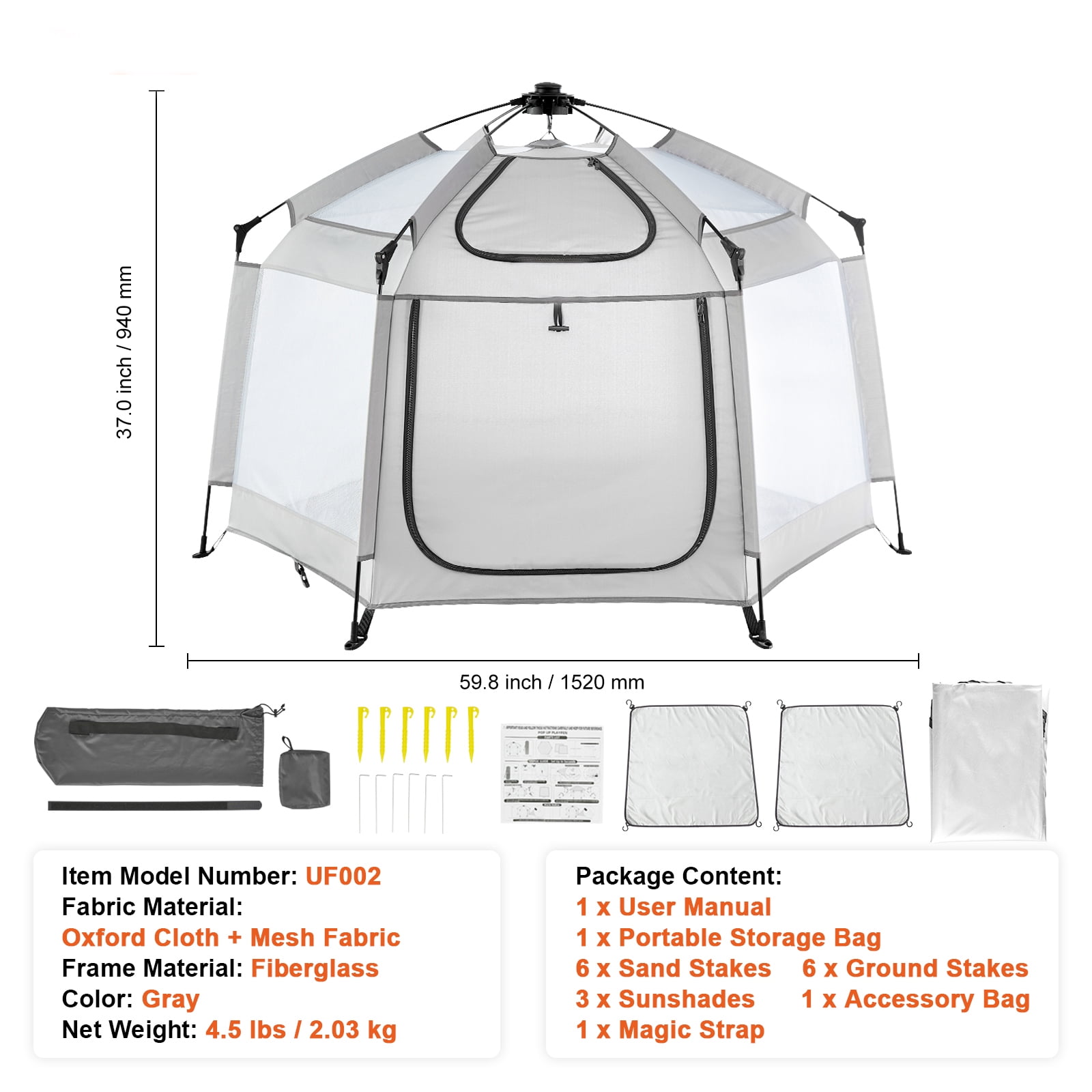 $59.33Product Description SKYSHALO Baby Playpen with Canopy At SKYSHALO 59.8″x59.8″ baby playpen, we blend safety and fun to create a spacious and secure playground for your little one. Easy setup and folding down for indoor/outdoor use. Also come with 3 UPF 50+ shade covers to shield baby from UV rays. Let your baby play, explore, and grow in the safe space. High Safety Say goodbye to worries about your child’s little fingers getting pinched. Our top-enclosed design ensures their playtime is safe and enjoyable, granting you peace of mind. Lightweight Strength Our glass fiber frame is the perfect adventure companion—light on weight, yet strong on elasticity and resistance to tension. It’s built to keep up with your baby’s explorations. Sun Protection Shield your baby from the sun’s harsh rays with the UPF 50+ sunshade covers. Let them bask in the sun without a care while you watch them grow. Security Comes First The breathable and tear-resistant mesh not only promotes excellent airflow but also creates a protective barrier against pesky insects. Your baby’s comfort is paramount. On-the-Go Convenience Designed to match your on-the-go lifestyle, our playpen easily folds down into the included storage bag in just 3 simple steps. Carry it effortlessly for outdoor adventures. Freedom to Explore Whether you’re picnicking, enjoying the beach or working out, our baby playpen is always ready to safeguard your little one. It frees up your hands and allows both you and your baby to share moments of joy, wherever you may be. Specifications Item Model Number: UF002 Fabric Material: Oxford Cloth + Mesh Fabric Frame Material: Fiberglass Color: Gray Net Weight: 4.5 lbs / 2.03 kg Product Dimensions: 59.8 x 59.8 x 37.0 in / 1520 x 1520 x 940 mm Package Content 1 x Portable Storage Bag 6 x Sand Stakes 6 x Ground Stakes 3 x Sunshades 1 x Accessory Bag 1 x Magic Strap 1 x User Manual