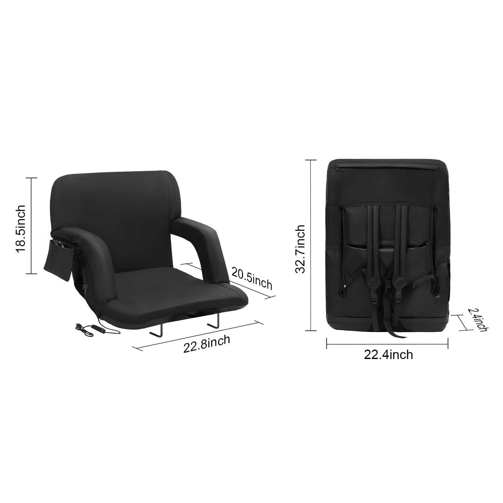 $65.35Product Description Courtroom seat with back support Portable seat with backrest that folds easily and can be carried using the included shoulder strap. It takes up very little space and can be easily stored in the trunk of a car. Easy to carry Portable seat with backrest that folds easily and can be carried using the included shoulder strap. It takes up very little space and can be easily stored in the trunk of a car. 3 speed heating function Dual heating and three-stage temperature control allow you to heat the seat and backrest simultaneously, or heat the seat cushion or seat backrest separately, ensuring comfort every season. High quality material The recliner is made of a sturdy frame, high-density sponge and waterproof 600D Oxford fabric for wear resistance and comfort. Weather-resistant surfaces are easy to clean and maintain. It comes with multiple pockets, perfect for storing water bottles, snacks and tissues. Easy to use The wide grandstand seat back with 2 shoulder straps and comfortable side handles gives you two carrying options. You can carry it on your back to free up your hands to carry other items, or you can use the ergonomically designed side handle for easy grip and handling when in a hurry. Stretch seat The seat is 22 inches wide and expandable to fit most people, making it the perfect seat for an indoor or outdoor party. Widely used The foldable and easy-to-carry seats are professional and reliable, perfect for outdoor sports events, concerts in the park, picnics, camping and beach trips. The best seats for indoor or outdoor parties!