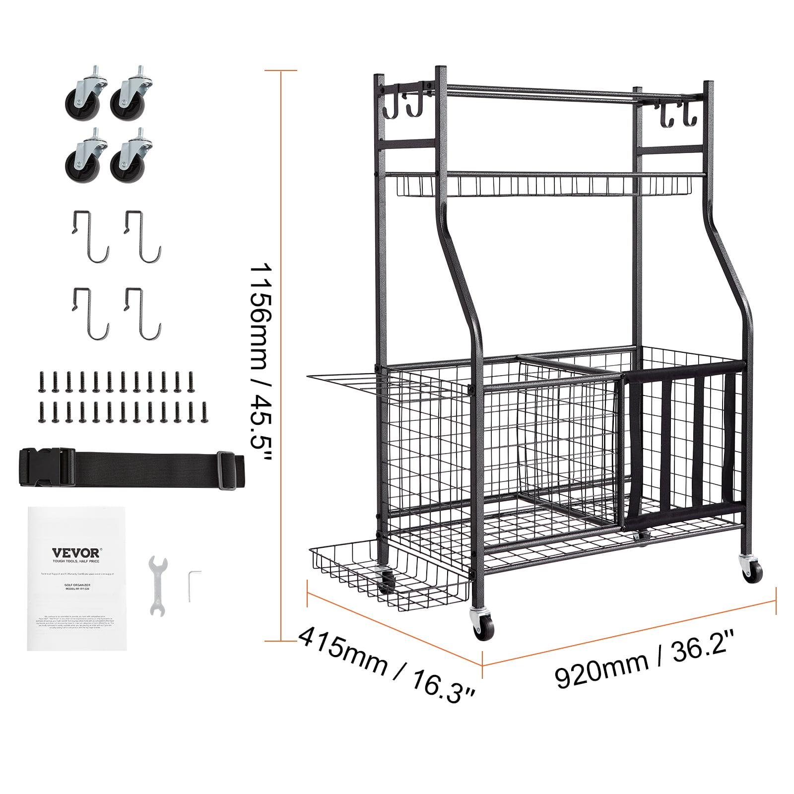$60.19Product Description Multifunctional Sports Equipment Garage Organizer Dedicated to providing sports enthusiasts with storage solutions for their equipment, aiming to achieve an effortless indoor and outdoor organizing experience. Ideal for every physical trainer, professional coach, and anyone organizing sports equipment, offering the best solutions. Multifunctional This sports garage organizer comes with a variety of accessories. All these storage accessories help to keep your sports equipment organized, ensuring your items are neatly arranged and truly saving space. Humanized Design Detachable hooks enhance storage space and methods; the new side shelf makes it easy to place various rackets and clubs; elastic bands maximize the storage space of the sports storage cart, making it easier to access items at the bottom; lockable wheels meet your needs for mobility. Sturdy and Durable Material This sports gear storage organizer is made from heavy-duty powder-coated steel frames and heavy metal wire mesh, durable and wear-resistant for many years of use. Scratch-resistant textured paint, waterproof, rustproof, and resistant to scratches, ensuring a longer-lasting storage solution. Suitable for More Settings This practical sports equipment is perfect for organizing items in gyms, schools, and any sports venues, easily keeping your space tidy and organized. Easy to Install Its simple structure and instructions make this garage toy storage organizer easy to install, with all necessary accessories included, offering straightforward and efficient assembly. Wheels with Brakes Features 4 universal wheels that can rotate 360°, allowing you to easily move it anywhere. 2 wheels are lockable. Perfect for both indoor and outdoor use, eliminating the hassle of organizing equipment after sports, letting you fully enjoy your activities. Specifications Item Model Number: RF-RY-028 Main Material: Q235 Product Weight: 8.4 kg / 18.51 lbs Product Dimensions (LxWxH): 920x415x1156 mm / 36.2×16.3×45.5 inches Package Content 1 x Sports Equipment Garage Organizer 1 x Set of Accessories
