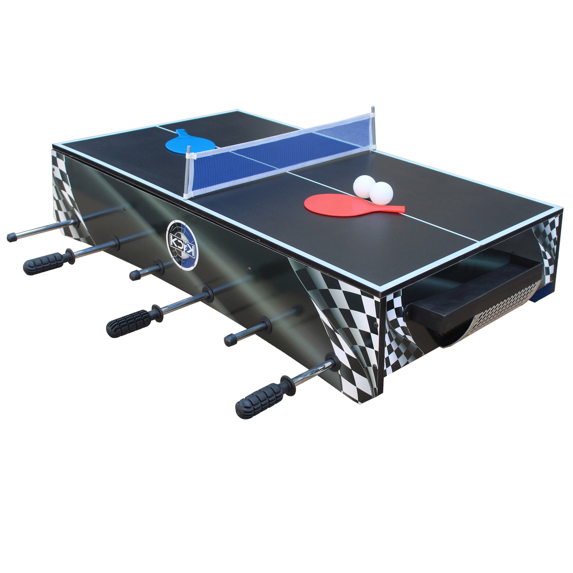 $86.89The KICK Convoy is the most convenient tabletop Foosball table in the industry! The table save space in your room, and lets you enjoy, a game of Billiards, Air-Hockey, Table Tennis and a Foosball match with your buddy, on one table! . Take this portable yet sturdy table wherever you go for hours of Foosball or ice hockey entertainment. Join the KICK family by purchasing the latest addition to the our Foosball table line up, the KICK Convoy Foosball Table!