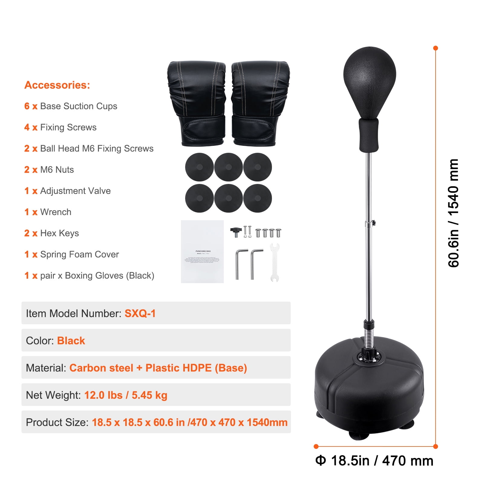 $57.61Product Description Punching Spinning Bar Freestanding punching bags are self-supporting boxing training equipment. Designed with reinforced springs for strong rebound, they can help improve punching speed and muscle elasticity, while also suitable for aerobic exercise, ideal for home and gym use. Easy Bounce Back Freestanding punching bags are self-supporting boxing training equipment. Designed with reinforced springs for strong rebound, they can help improve punching speed and muscle elasticity, while also suitable for aerobic exercise, ideal for home and gym use. Adjustable Height The punching bag kit comes with a stand, suitable for people of different ages and heights, adjustable according to children’s body size. High-quality Materials This reflex boxing bag is made of PVC leather sandbag + over-gluing + encrypted fabric, with the inner bladder upgraded from rubber to latex, allowing users to train for extended periods without worrying about damage. Stable Base The base can be filled with water or sand to maintain stability. The suction cups at the bottom prevent floor scratches and ensure stability during boxing. Versatile Application Scenarios The boxing training equipment helps users improve reaction, speed, accuracy, and striking ability, suitable for both beginners and experienced individuals looking to hone their skills. Easy to Install Installation and storage can be completed within minutes. Fill the base with a mixture of sand and water for increased stability. Package Content 1 x Boxing Bag Set 1 x Set of Accessories