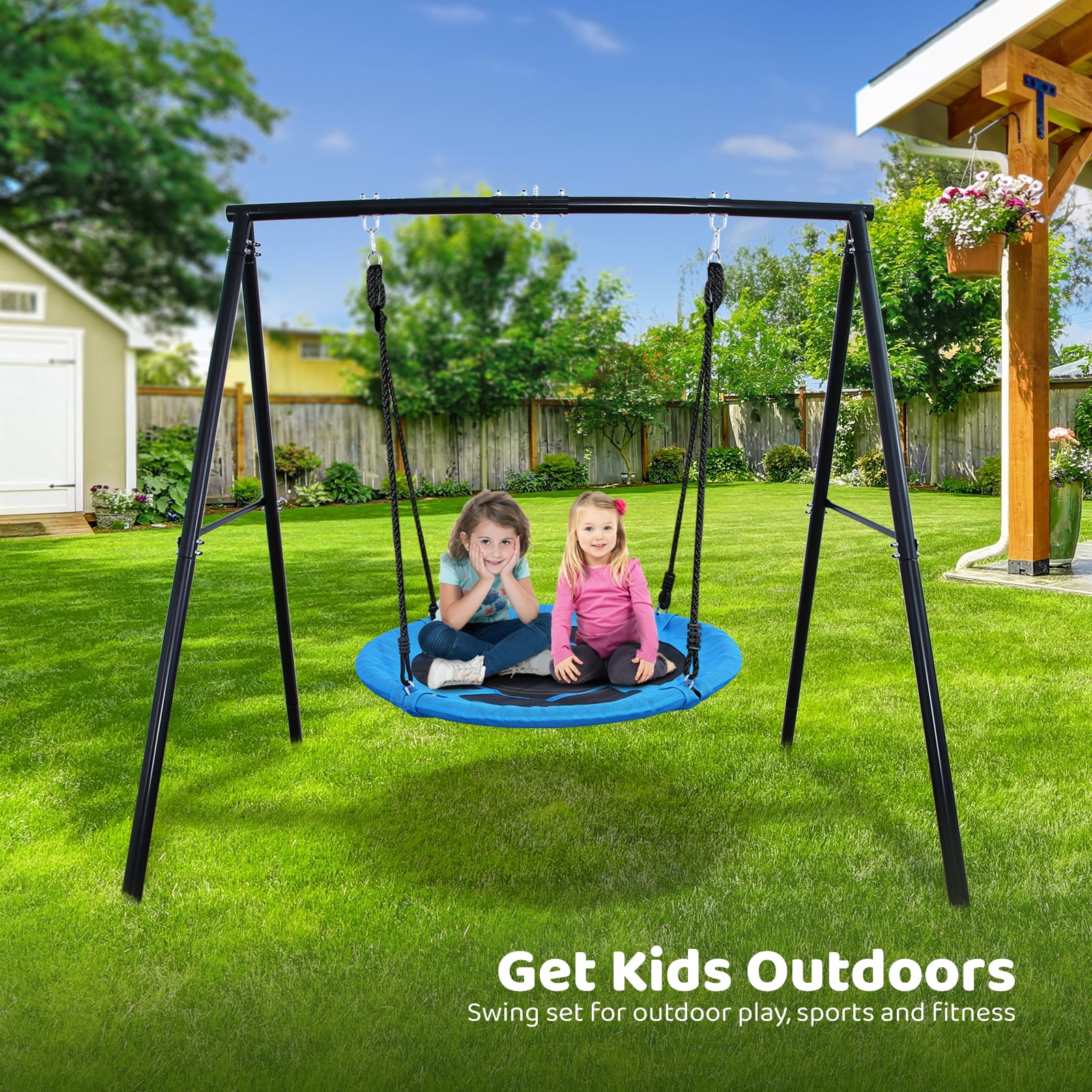 $98.89COMBO METAL SWING SET: Up to 440lbs weight capacity swing set equipped with 1 X 71″ swing frame and 1 x 40″ round saucer seat. Perfect for kids or adults to play in your garden, backyard, playground, and more indoor/ outdoor places! MULTIFUNCTIONAL SWING SET: Our swing set provides multiple ways to swing, hang, and soar. You can hang with the swivel for 360°rotation (350 lbs Max) or with the ropes to fly back and forth (440 lbs Max). Good for sensory regulation, motor planning and coordination, and social skills. SUPER STRONG & DURABLE FRAME: 2-inch heavy-duty powder-coated steel tubes prevent snags, pinches, and rust, ensuring parents can feel at ease while their kids are playing. A-frame construction creates substantial stability to support long-lasting value in outdoor fun. The saucer swing is crafted with Textilene Cloth with strong UV resilience for extra protection. GREAT FOR OUTDOOR PLAY: Our swing set provides multiple ways to swing, hang, and soar because of its 71″ height and 74″ length frame, and 40” round swing seat. You can attach all types of swings you have to our swing set. EASY TO ASSEMBLE: Quick and easy assembly saves time and hassle. Both the swing frame and swing seat are easy to assemble; Components are pre-drilled for assembly. All accessories and hardware are included and listed in detailed instructions. Low Maintenance, no staining or painting required.