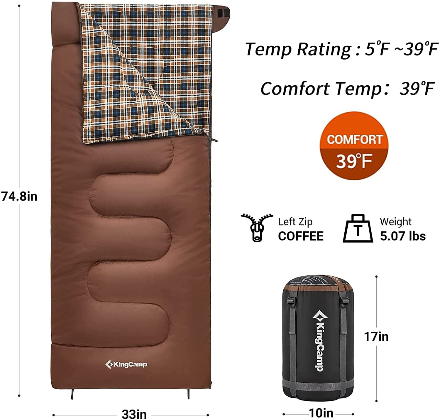 KingCamp XL Lightweight Cotton Flannel Sleeping Bag – Cold Weather Ready, 5℉-39℉, Envelope Design for Adults, Ideal for Backpacking & Camping, 5.07LBS ,Left (Coffee)