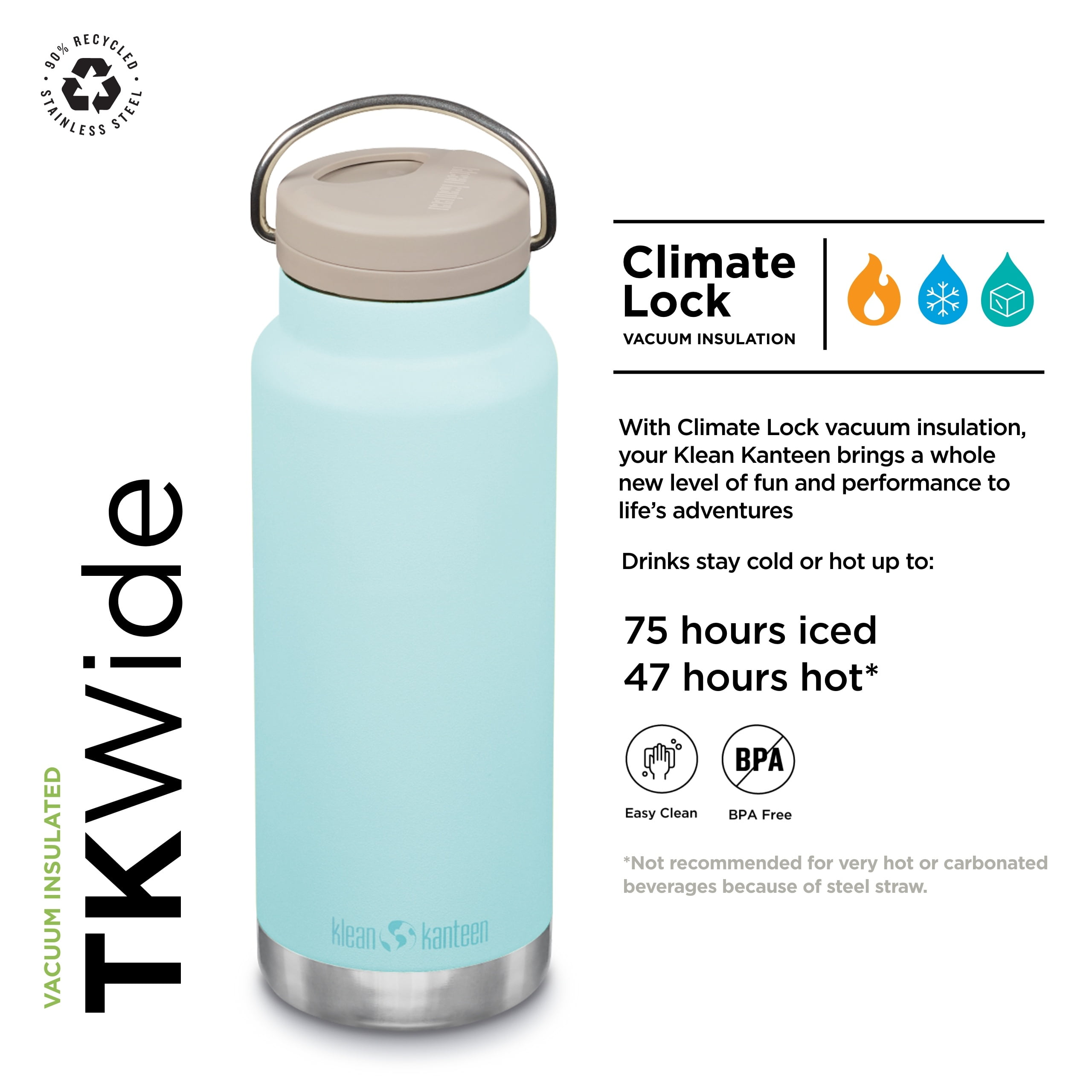 $40.38Our 32 oz TKWide insulated water bottle was designed with versatility and portability in mind, to create the best water bottle, iced coffee mug, sport bottle, and insulated cup, all in one package. The TKWide 32 oz features our TK Closure internal thread design with a smooth, rounded lip for comfortable drinking and easy cleaning. It comes with a leak-proof Twist Cap with a built-in reusable steel straw that fits our 32 oz bottles. Klean Coat colors and fun designs make it great for kids and those young at heart! Please note the Twist Cap is not suitable for liquids above room temperature. It is not intended for hot or carbonated beverages because of the steel straw.As a family and employee-owned company, we don’t have to answer to stakeholders. We’re free to operate based on our values every single day. We’ve built our business by prioritizing the well being of people and the planet and by designing sustainable, high-performance products.We believe that all businesses should be accountable for their carbon emissions. As a Climate Neutral Certified Brand since 2019, we measure our footprint annually, reduce what we can, and offset the rest by purchasing verified offsets.Every time you make a purchase from Klean we invest 1% of the sale into organizations working hard to make the world a more resilient and sustainable place. Through our 1% for the Planet membership, our customer community has allowed us to donate over 3.7 million dollars to organizations doing significant work in our key areas of focus: plastic pollution, safe consumer products, conservation and climate, and outdoor stewardship.As a certified B Corp, we’re part of a movement of more than 3,000 global companies that meet high standards of social and environmental transparency, accountability, and performance. Together, we’re redefining success in business.