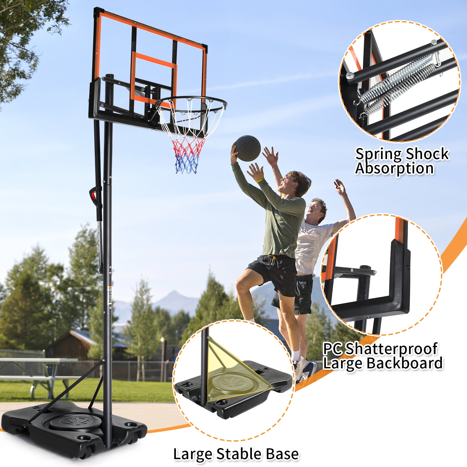 $146.19Original price was: $146.19.$128.99Current price is: $128.99.【EXCLUSIVE MOLDED LARGER BASE】: Our basketball hoop system boasts a robust, larger base measuring 44”L x 28”W, compared to other 36”L x 24”W. This design ensures greater load-bearing capacity and can withstand strong winds. The base can be filled with water or sand to guarantee excellent stability and safety for every shot. 【ENTERTAINMENT FOR ALL AGES】: With its adjustable height feature, our basketball hoop is perfect for all age groups. It provides a fun activity for kids after school, encouraging them to stay active, and offers a relaxing pastime for adults after work. This basketball hoop is ideal for promoting family and friends’ bonding. 【HEIGHT ADJUSTABLE FROM 4.4FT TO 10FT】: The adjustable lift system of our basketball hoop features 11 height levels, providing versatility for various settings. It can be installed both indoors and outdoors, including driveways, backyards, front yards, parks, playgrounds, garages, gyms, etc. The height ranges from 7.55ft to 10ft with three poles, and from 4.43ft to 6.4ft with two poles. 【PREMIUM DURABILITY】: Our outdoor basketball hoop is built to last with high-quality materials. It includes a shatterproof backboard, shock-absorbing hoop, thick solid PE net, and anti-rust steel poles and hardware, ensuring long-term durability and reliability. 【SIMPLE INSTALLATION】: Assembling our portable basketball hoop is straightforward with labeled parts and clear, easy-to-follow instructions. Additionally, an online assembly video is available to assist you further.