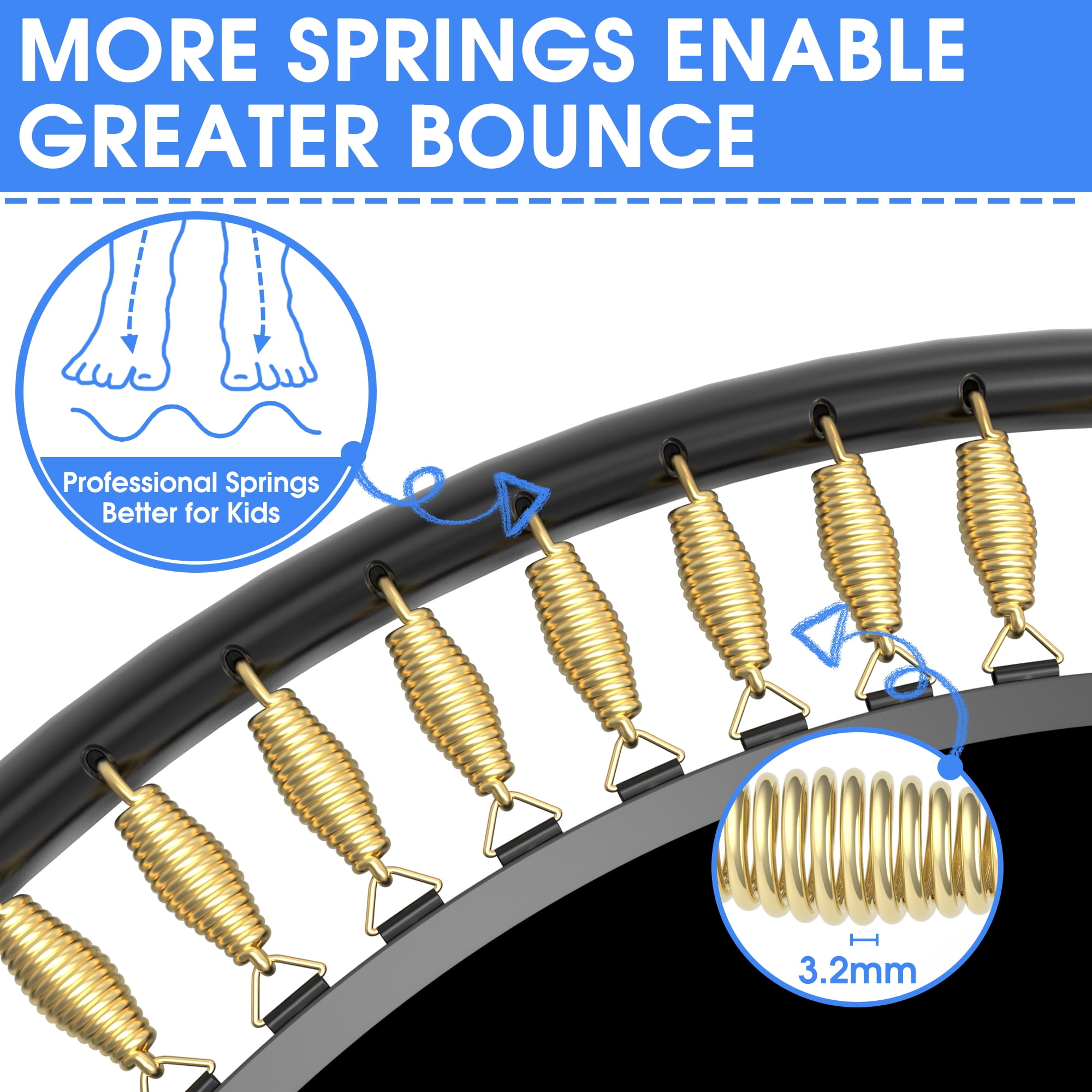 $223.59Original price was: $223.59.$117.82Current price is: $117.82.Your kid’s fun and safety – Kumix Responsibility! Newly Upgraded Spray Frame All frames of the Kumix 5ft trampoline adopt an upgraded black spray coating process to ensure the stability and durability of the trampoline, make all the frames anti-rust and last for decades. All-in-one Jumping Mat The waterproof surface, UV-resistant and fade-resistant jumping mat is closely connected with the spring cover mat to form an integrated jumping mat, providing longer service life and better bounce. Enclosure Net & Double Zipper The no-gap 31.49″ high enclosure net features arched zippers and double inner and outer zippers ensure kids safe while jumping. Thickened Pole Foam Pole-sleeves, the enclosure poles are padded with 10mm foam, can protect your kids from banging against the steel pole, absolutely safe and reliable for children. Snap Design 5ft mini trampoline has a screwless design, an “SNAP” design, and the assembly time is reduced by at least 30 minutes. Best Gift Choice Kids all-gift mini trampoline is the best gift for kids. It improves their coordination, balance and agility and also reduces the time spent playing video games. Specifications: Size: 5FT Springs: 36 PCS Leg: 3 W-shaped Legs Pole: 6 PCS Weight Capacity: 400 LBS Weight Capacity, (Single: 220lbs) Colors: Green&Blue/ Pink&Blue/ Red&Blue/ Yellow&Blue/ Purple&Blue Extra Gift: Rings, Swings, 12 Ocean Balls, Basketball, Pump Note: We provide 7×24 customer service and 12 months manufacturer warranty. If you have any questions, please feel free tocontact us.