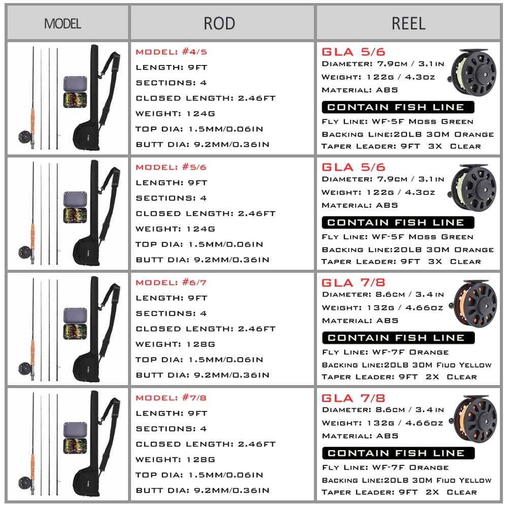 $63.98Original price was: $63.98.$51.59Current price is: $51.59.Fly Fishing Rod 9 ft, 4-Piece, 5/6, 7/8 Weight Fly Fishing Rod and -machined Reel Combo Complete Starter Package Comfortable rubber cork handle according to the ergonomic design which optimize your fishing experience. Rod:#7/8 Model: #7/8 Full Length: 9ft Section: 4 Top Dia.: 1.5mm Butt Dia.: 9.2mm Closed Length: 2.46ft Weight: 4.5oz Reel: GLA 7/8 Material: ABS Diameter: 3.4in Weight: Approx. 4.6oz Fly Line: Color: WF-7F Orange Backing Line: 20lb 30m Fluorescent Yellow Taper: 9ft 2x clear Rod: #5/6 Model: #5/6 Full Length: 9ft Section: 4 Dia.: 1.5mm Butt Dia.: 9.2mm Closed Length: 2.46ft Weight: 4.5oz Reel: GLA 5/6 Material: ABS Diameter: 7.9cm / 3.1in Weight: Approx. 4.3oz Fly Line: Color: WF-5F Moss Green Backing Line: 20lb 30m Orange Taper: 9ft 3x clear Storage Bag: Material: Canvas Size: 31.9 * 7.9in Tube Diameter: 2.0in Strap Length: 23.6 – 39.4in Weight: 13.5oz Package List: 1 * Fishing Rod Bag, 1 * Fishing Rod, 1 * Fishing Reel, 1 * Fishing Box with 20 Flies