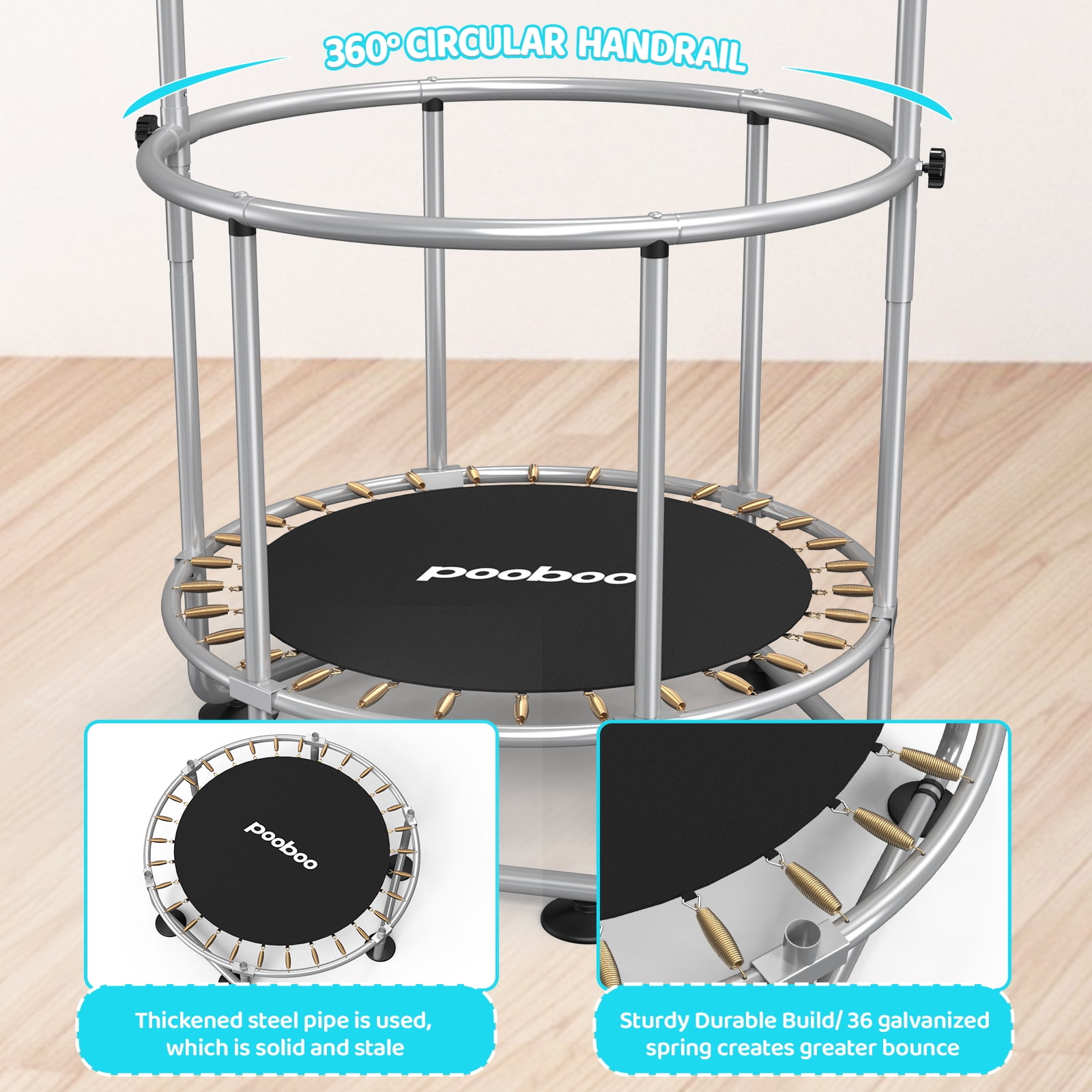 $77.39Bring fun together with health and fitness to your home and family with this Complete High Quality Pooboo Kids Trampoline and Enclosure Set! This trampoline is both durable and padded to provide hours of safe, active fun for your little bouncers. The frame is made of high-quality steel to ensure safety. Round zippered entrance enclosure net is supported by padded poles for added safety and 100% secure fun jumping experience for your kids and their friends! Features Brand new and high quality Easy to assemble, no additional tools required Great cardio workout that is easy on the joints Rust-resistant frame offers long-term use Easy to handle.Indoor and outdoor use Specification: Product Size: 60″ Shape: Round Main Material: Steel Main Color: Like pictures Number of Legs: 3 Jumping Mat Material: PP Weight Capacity:450lbs Springs: 36 Galvanized Springs