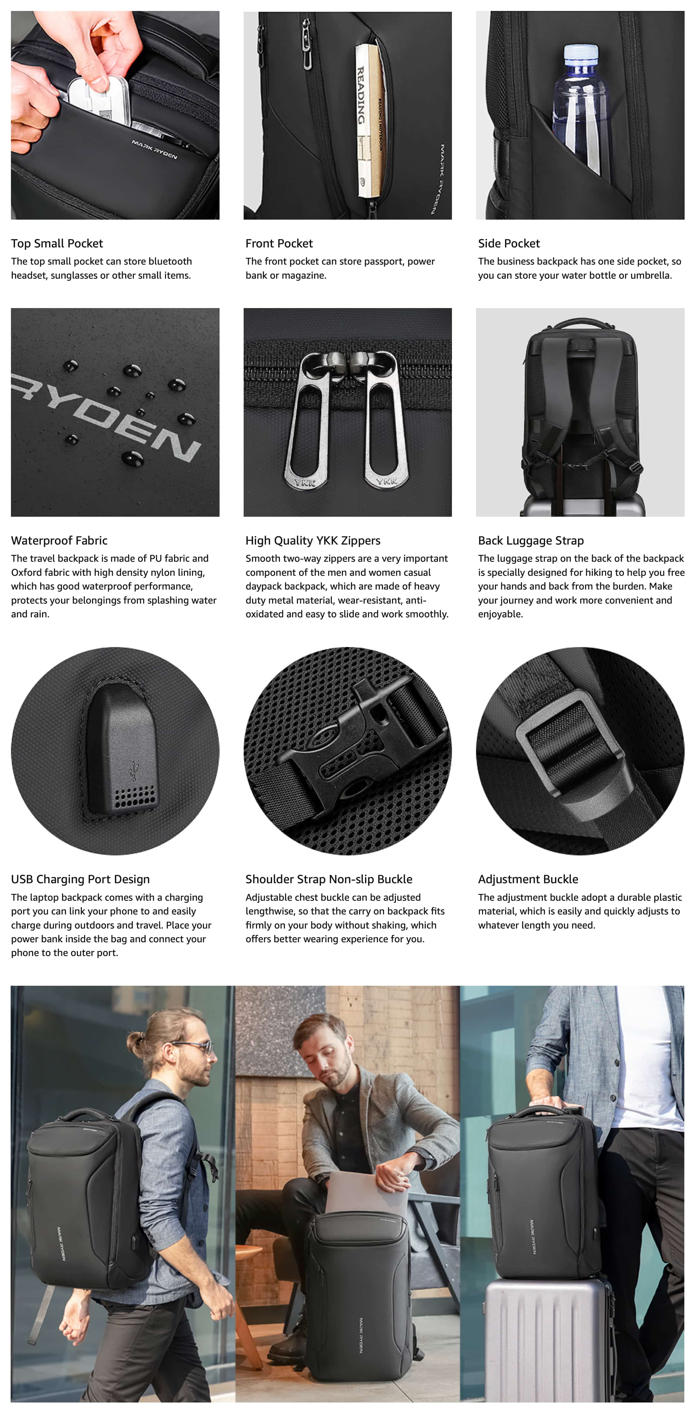 $59.33Original price was: $59.33.$49.86Current price is: $49.86.The Mark Ryden 17.3 inch Laptop Backpack is a versatile and high-quality backpack, designed for business, travel, and casual use. Featuring a sleek sports car shape design, this backpack is perfect for professionals on the go. It includes a built-in USB charging port, making it convenient to charge your devices while traveling. With multiple pockets for organization, you can easily store your belongings, including laptops up to 17.3 inches, water bottles, umbrellas, and other essentials. Made from waterproof PU, nylon, and Oxford fabric, the backpack ensures your items stay protected from splashes and rain. High-quality YKK zippers and an adjustable chest buckle enhance durability and comfort. Additionally, the luggage strap on the back makes it perfect for travel, allowing you to secure the backpack onto your suitcase for hands-free convenience. Key Features: ⢠Brand: Mark Ryden ⢠Size: 19.7 x 13.0 x 7.9 inches ⢠Weight: 1.3 kg ⢠Material: Nylon + PU + Oxford fabric ⢠Assembled Product Width: 13.0 inches ⢠Condition: New ⢠Pockets: Top pocket for small items like sunglasses or Bluetooth headphones, front pocket for passport or power bank, and side pocket for water bottle or umbrella. Whether youâre heading to work, school, or on a weekend getaway, the Mark Ryden 17.3 inch Laptop Backpack offers comfort, durability, and style.