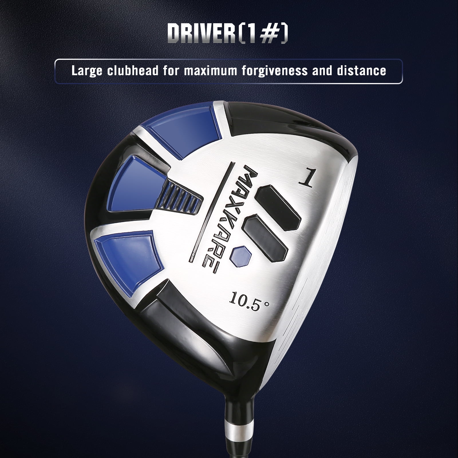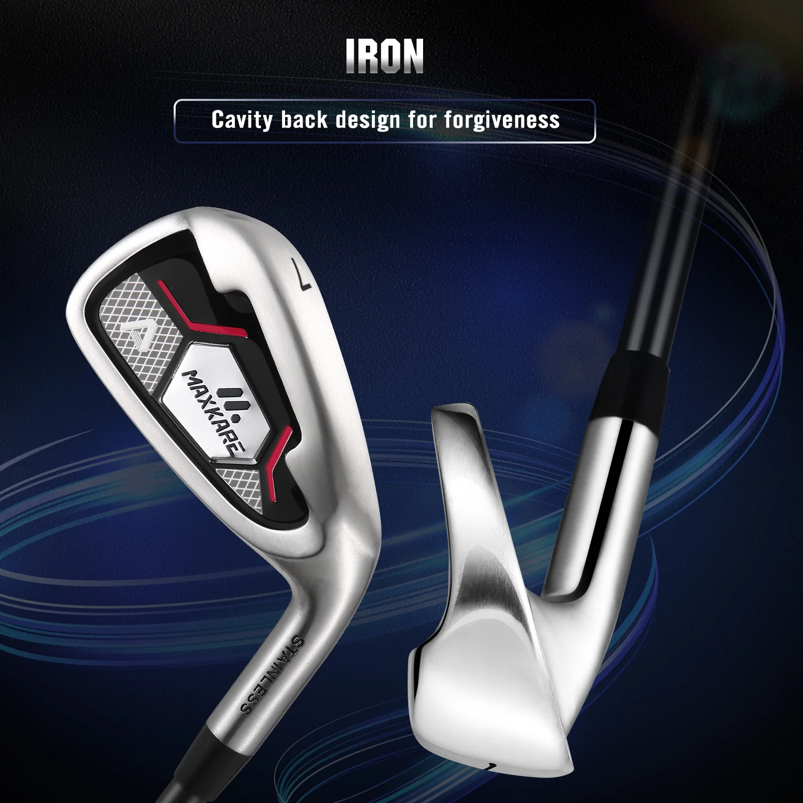 $283.79Original price was: $283.79.$146.19Current price is: $146.19.Features 1. Acoustic Structure Technology The combination of advanced geometric structure and acoustic design, as well as the back badge made of a variety of materials, can reduce the vibration of golf clubs and give golfers a more confident hitting sound and feel. 2. Low Barycenter & High Rebound Coefficient The new grooved hosel with a low barycenter, combined with a thin face with a large rebound coefficient of golf clubs, can provide golfers with a continuous and stable hitting effect. The 360° deep space concave back design of the golf clubs reduces the weight at the top line, redistributes the weight, and lowers the barycenter, while the tuning structure can help absorb vibration. 3. New Forging Process The forging process of the golf clubs can achieve better pitch and fault tolerance for the club. Under suitable temperature and stress conditions, the forging process increases the density of the material, which greatly increases the hardness and strength of the club, and brings durability in use. 4. New Material Structure + Apportioned Counterweight The shaft of the golf clubs is made of multiple layers of black fiberglass for lighter weight. Wooden club head match with aluminum alloy; iron club head match with stainless steel; putter clubhead match with titanium alloy to improve stability and fault tolerance professionally and bring a confident experience to golfers. 5. Complete Golf Clubs Set for Male The MaxKare 9-piece golf clubs set for adult is designed for maximum performance right out of the box. The set includes Driver, Fairway, Hybrid, 6 – 9 Iron, PW, Putter, Stand Bag, and 3 Head covers. Total 13 pieces(9 clubs, 3 head covers and 1 golf bag) Maintenance 1. Before playing, please use a dry towel to rub and preheat the clubhead to increase its temperature and soften it. 2. After playing, please wipe the clubhead with a towel to remove dust and use a pointed object (such as cotton swabs) to remove the mud in the groove. Attention: Do not use metal objects to remove the mud because it will scrape off the coating of the club head, which will make the clubhead rust easily over time. 3. Please wipe the club with a damp cloth and dry it with a dry towel. Wait for the club to dry completely before putting it in the bag. Package Included (13 Pieces in Total) Driver- #1 Wood- 10.5°-45“Length- 1PCS Fairway- #3 Wood- 15°-43″ Length-1PCS Hybrid- #4H Wood- 24°-40″Length-1PCS 6 Iron- 29°-37.5″ Length-1PCS 7 Iron-32°-37″ Length- 1PCS 8 Iron-36°-36.5″ Lenth- 1PCS 9 Iron-41°-36″ Length-1PCS PW Iron- 45°-35.5” Length-1PCS Putter- 3°-34“ Length- 1PCS Head Covers-3PCS Stand Bag- 1PCS