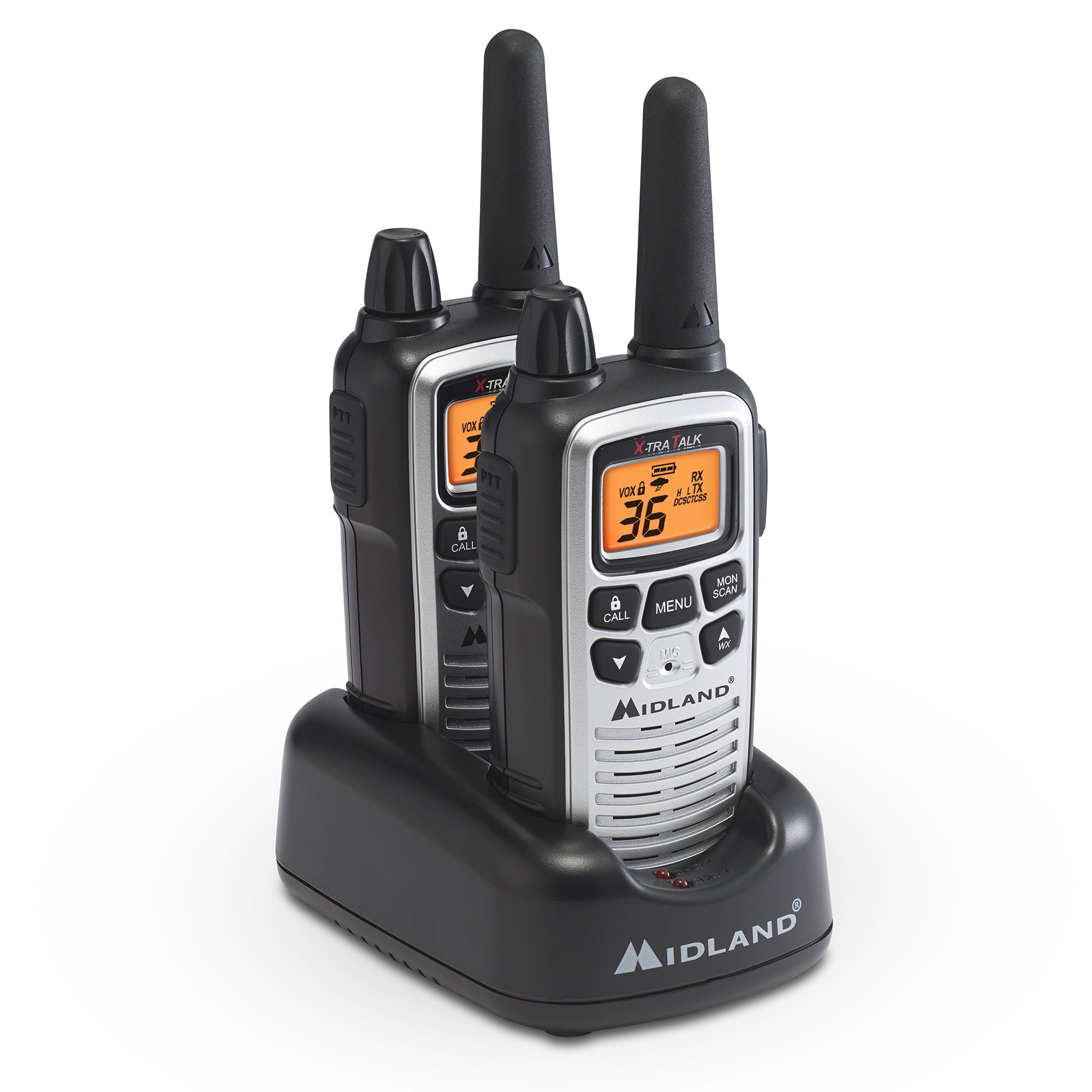 $60.19The Midland Radio LXT600VP4 walkie talkie pair-pack ensures crisp, clear communication with easy button access, as well as Midland’s signature Weather Scan + Alert Technology NOAA Weather Scan. Our weather alert system will sound an alarm indicating that there is a risk of severe weather in your area, ensuring your safety and preparedness in any type of weather situation. Other radio features include: eVOX hands free communication, 22 channels plus 14 extra channels with pre-programmed privacy codes, 121 privacy codes, channel scan, and silent operation. Charge your radios with the included desktop charger and rechargeable battery packs. No matter if you’re hunting, camping, biking, or out with your family, make sure you’re prepared with the LXT600VP4 two-way radio.