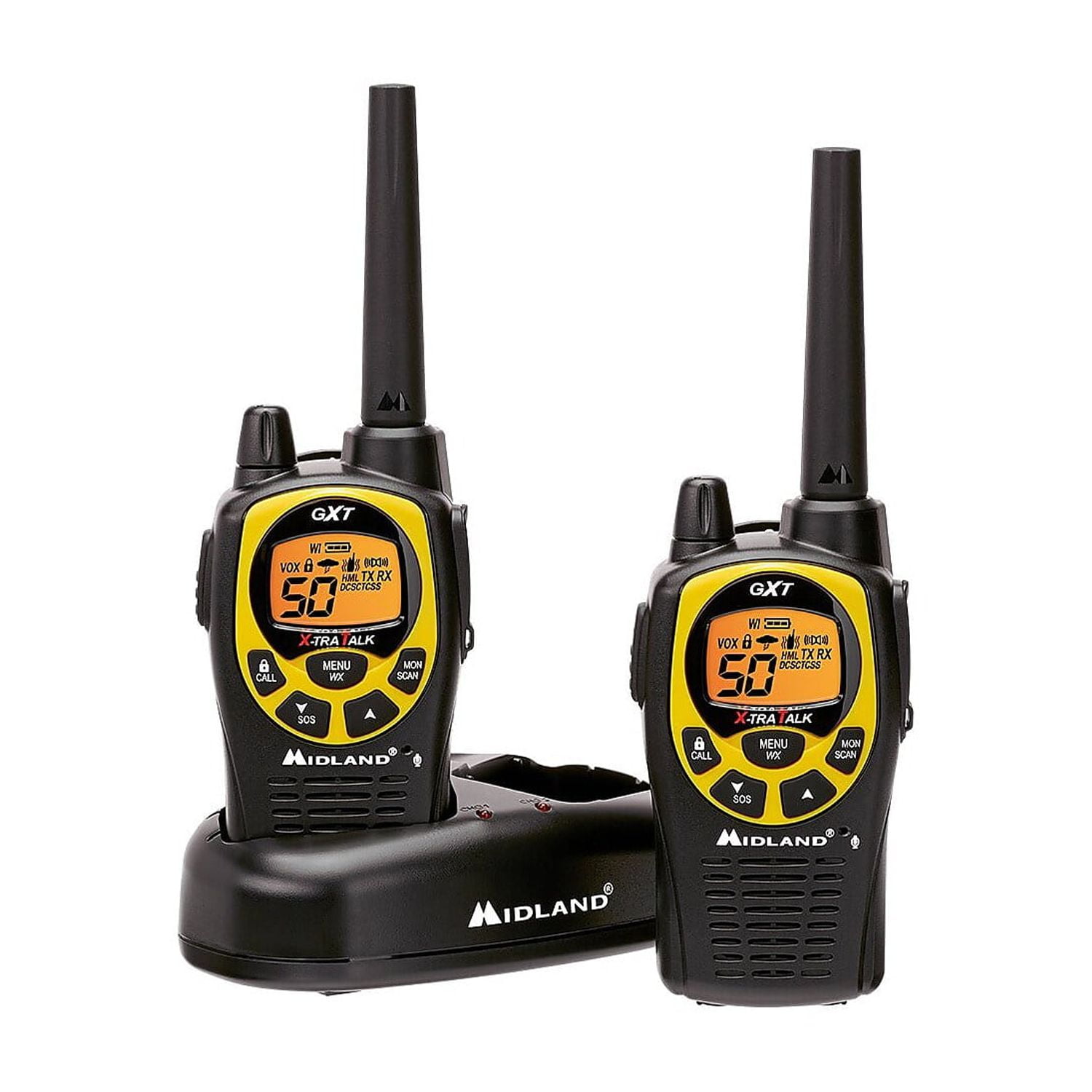 $85.99Midland GXT1030VP4 36-mile 50-channel gmrs two-way radio (black/yellow). Bold yellow faceplate. With 50 channels, this top-selling NOAA weather alert two-way radio gives you maximum output power with Xtreme Range Technology. JIS4 Waterproof – Protection in all directions against light rain or splashing water. 142 Privacy Codes – Gives you up to 3,124 channel options to help you block other conversations. 36 Mile Range- Longer range communication in open areas with little or no obstruction X-TRA TALK Power – Maximum allowed by law SOS Siren – Allows you to send out distress/locator signals in an emergency situation.