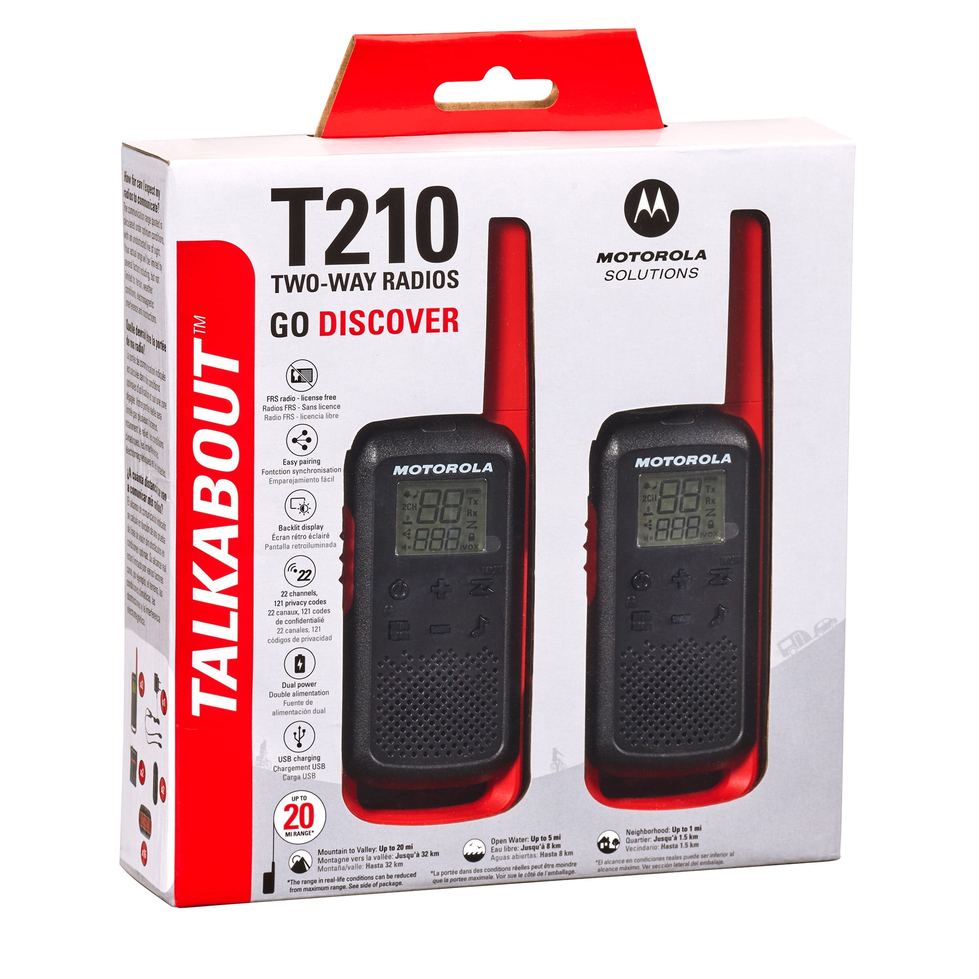 $42.99Fully featured, tough and stylish, the TALKABOUT T210 walkie-talkie is the ideal way to stay connected during outdoor adventures. At home, on the campsite, at a festival or hiking, the TALKABOUT T210 keeps you in touch. The easy pairing button makes setup a breeze and with USB charging, you can conveniently power up. It’s license free and also includes key features such as LCD display, 22 channels and up to 20 mi. range*, with no call charges.