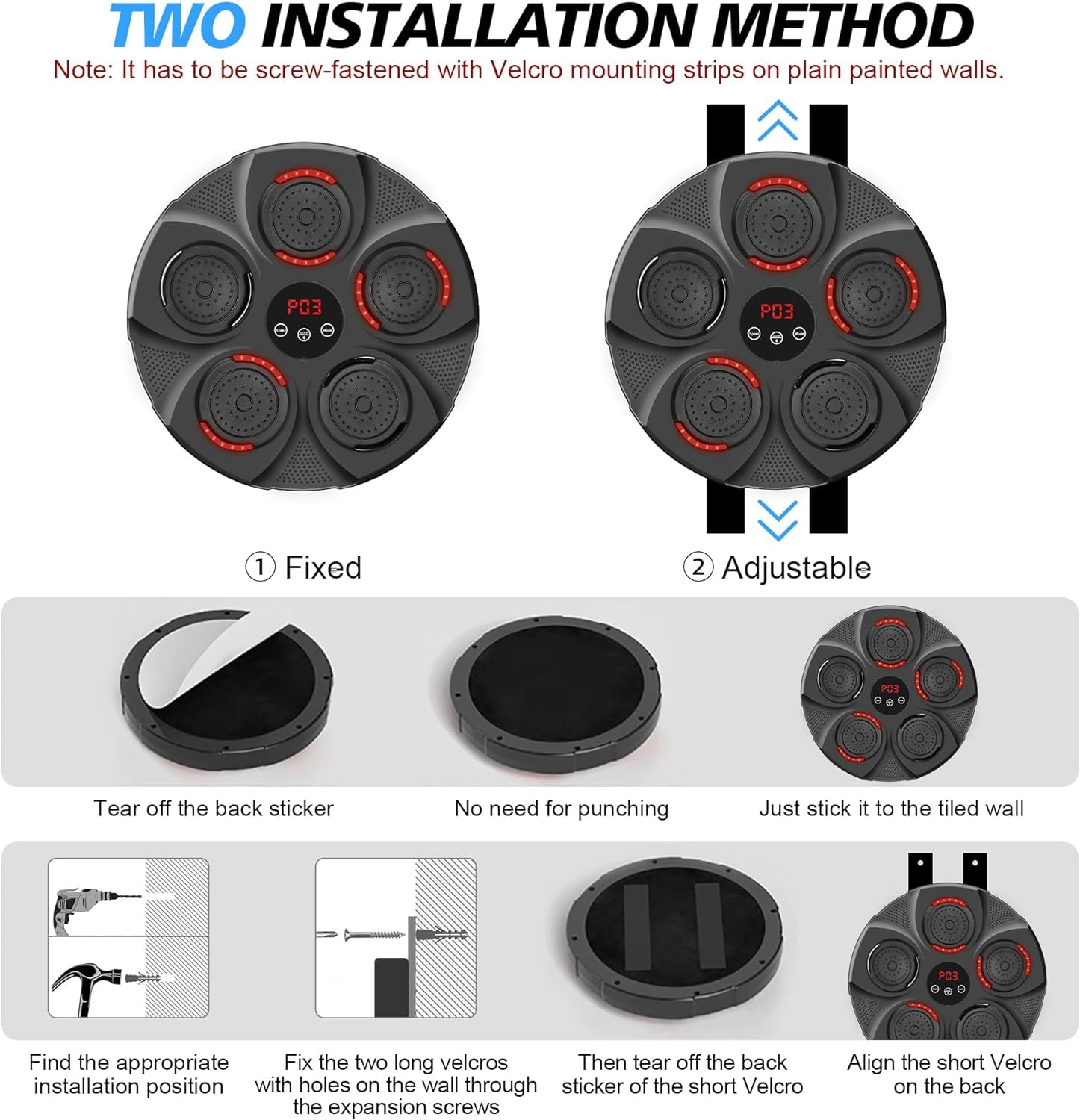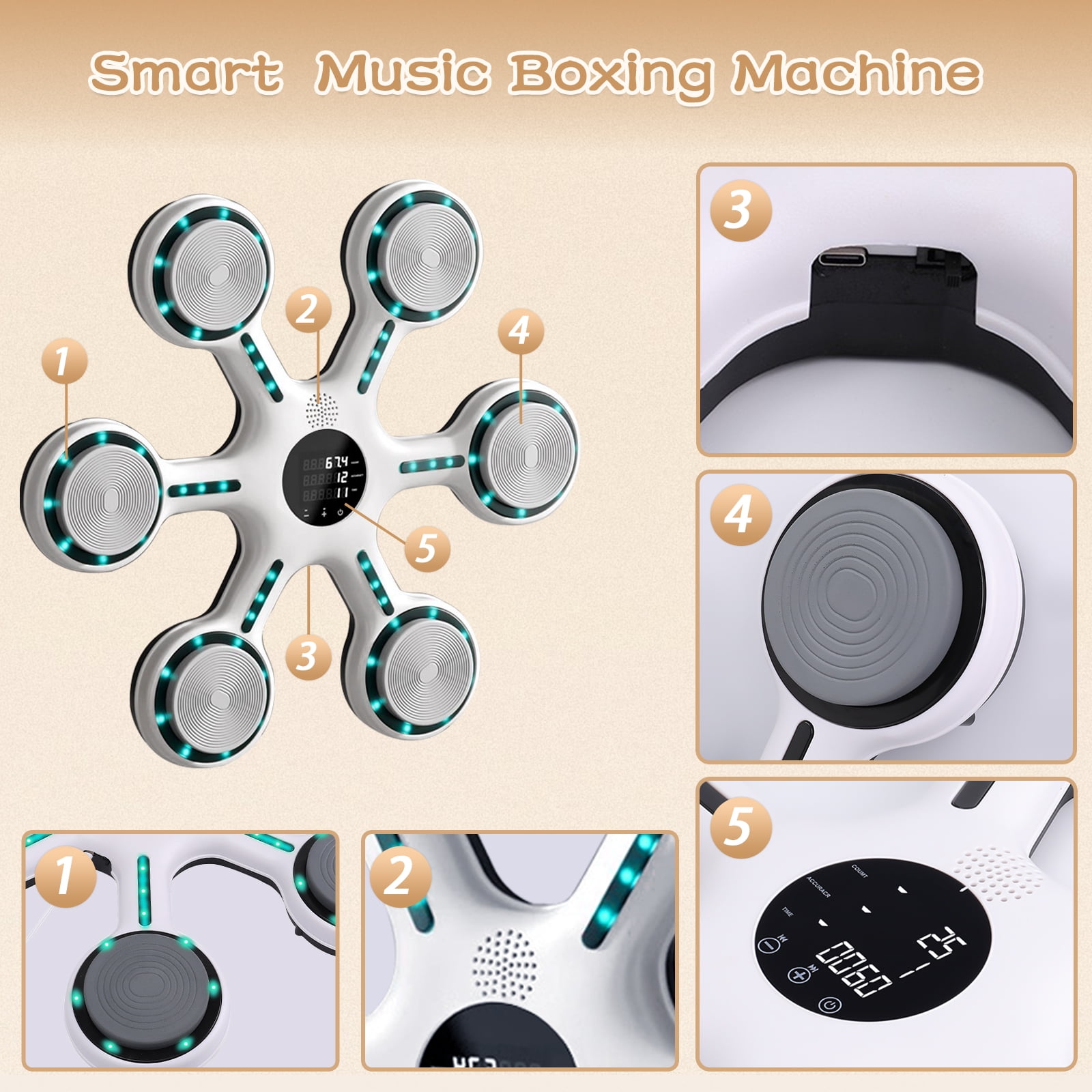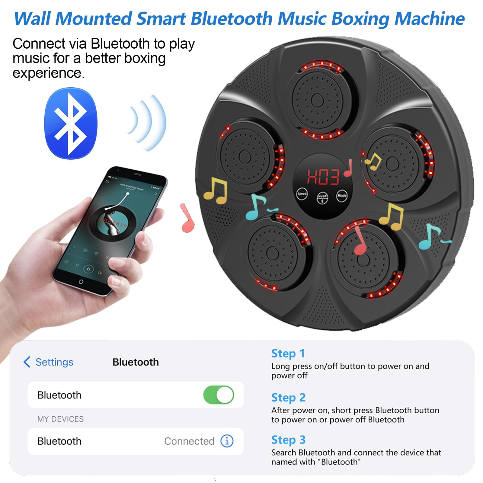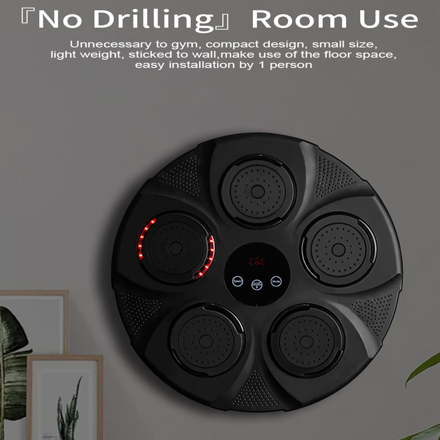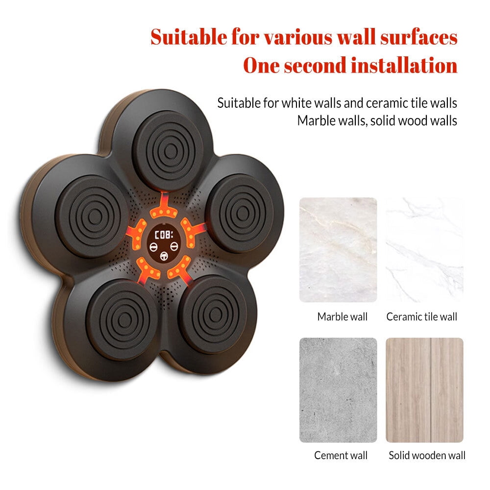 $51.59The boxing machine can be a perfect daily exercise tool for you to enjoy exercising at home with your family. Enjoy a full-body workout targeting different muscle groups without the need for a sparring partner. It is an essential tool for weight loss, fitness, and sculpting, and also offers family entertainment during holidays. Smart Music Boxing Machine This music boxing machine has 9 modes and speeds to meet the needs of most people. When the boxing target lights up, hit the target to make the light change position. Continuous training can improve your reaction speed and body coordination. LED Display & Bluetooth The smart music machine is equipped with a smart touch screen with a smart counting function that can record every hit to help users track and evaluate their growth. Bluetooth connectivity lets you play your favorite music, while upgraded speakers and cool lights keep you immersed. High-Quality Boxing Target This boxing equipment is made with featuring advanced pressure sensors, EVA cushioning pads, sturdy PC panels, and ABS alloy materials. Withstand weights up to 880 pounds. The impact surface made of high-quality foam material has stronger rebound and shock-absorbing effect than most boxing targets, better protecting your hands. The smart music boxing target is stylish, sturdy and durable. Easy to Install The Music Boxing Machine is wall-mounted, no need to drill holes in the wall. The boxing machine can be easily installed on the wall using Velcro, reducing installation trouble and time. You can enjoy professional boxing workouts at home, saving time and money. Matters needing attention: 1. Please fix this product on a sturdy and reliable wall. When striking, please strike within the striking area. lt is strictly prohibited to hit the corners to avoid hand injury or equipment damage 2. This product is suitable for adult use. Children should be guided to use it under adult supervision. 3. Beginners should not use excessive force to avoid hand injuries. During exercise, first pay attention to safely and strictly prohibit leg or knee strikes. 4. If the device cannot be turned on or there is an abnormality, please check if the battery is too low. It should be charged in a timely manner, and the time charging time should not exceed 8 hours. If it is not used for a long time, it is recommended to charge it once every 1-2months. 5. This product is not waterproof. When wiping boxing targets, use a dry cloth and do not get wet. 6. Please keep the instruction manual properly for emergency use.