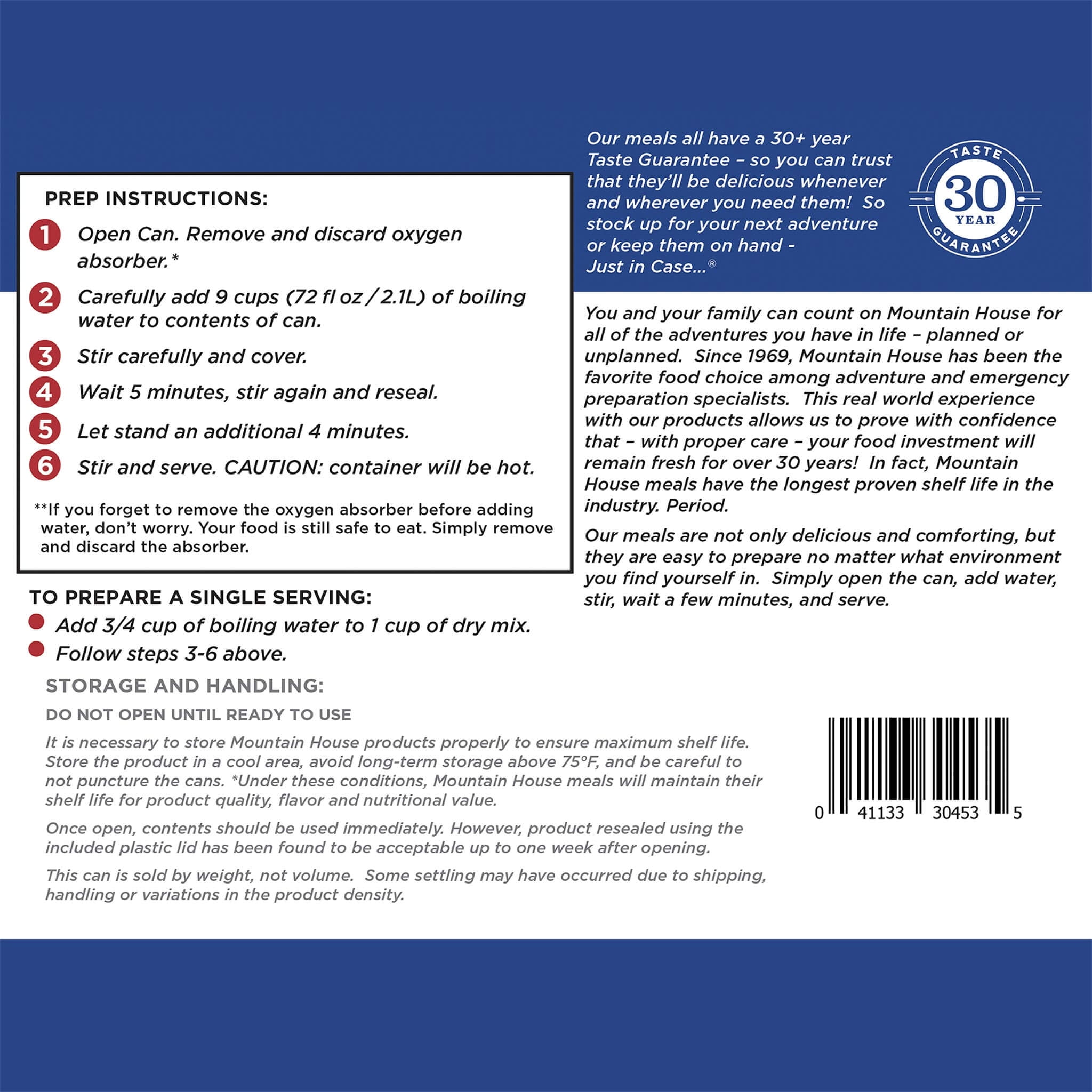 $257.99Just add hot h20. Protein packed. Long shelf-life. 100% natural meat. Never chewy or oily, this freeze-dried meat tastes great because it retains the original taste, texture, nutrients, and aroma of the chicken. Prepare just by adding water. Just add water and in a matter of a few minutes you are eating great-tasting meat the whole family will benefit from, protein is a must in all pantries. Be ready for decades to come with a 25+ year shelf life you can enjoy the peace of mind that comes from being prepared. Like many say: Prepare for the worst but hope for the best. Our freeze-dried diced chicken makes a wonderful addition to your ingredients so when you make your favorite recipes from chicken enchiladas to chicken salad sandwiches you are set. Also a great addition to ready-to-eat meals that don’t have meat like pasta parmesan and pasta primavera. Mountain house freeze-dried foods are at the top in terms of quality and taste.