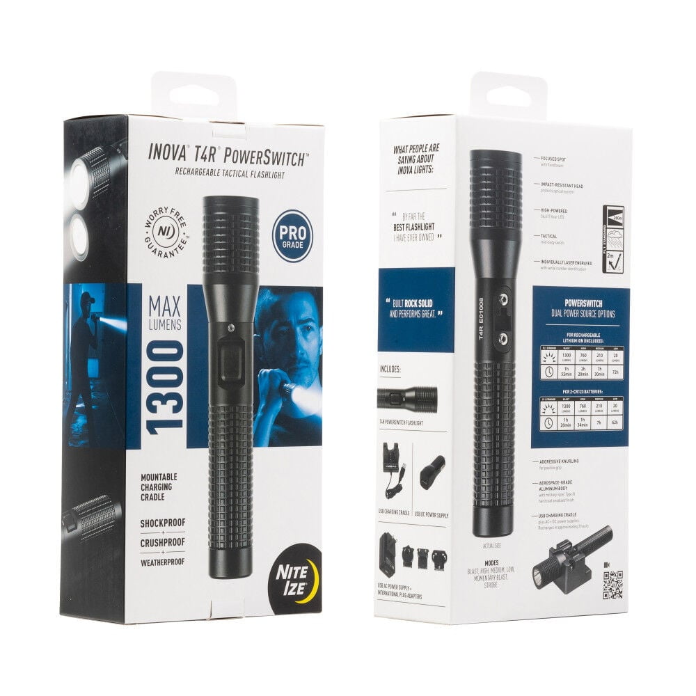 $137.40Solve an everyday problem like having a reliable and powerful light source with the Nite Ize INOVA T4R Powerswitch Rechargeable Tactical Flashlight. This tactical flashlight is a must-have for law enforcement and first responders. This flashlight is designed to be your reliable companion for all your outdoor adventures. Whether you’re in an emergency or setting up a campsite, this flashlight is what you need to illuminate your surroundings. This flashlight delivers a maximum brightness of a whopping 1300 lumens. The flashlight’s beam stretches to an impressive distance of 853 feet, making it perfect for professional use. This tactical camping and hiking flashlight offers different modes, including blast, high, medium, low, momentary blast, and strobe. This drop-proof camping accessory is waterproof up to 1 meter and features an impact-resistant head, ensuring it can withstand the rough, outdoorsy life. With the included mountable USB charging cradle, the high-powered lithium-ion battery fully recharges in just 3 hours and will power the T4R for up to 72 hours. With the PowerSwitch technology, you can run the flashlight on its included rechargeable lithium-ion battery or two non-rechargeable CR123 batteries, giving you more flexibility. Our mission at Nite Ize is to design and manufacture inventor-driven products that organize your life, protect your gear, light your way, and creatively solve your everyday problems. Nite Ize began in 1989 with one entrepreneurial spirit, an innovative product idea, a small Colorado cabin, and enough passion to lay the foundation of who we are today. CEO and Founder Rick Case continues to helm the Nite Ize ship, instilling his energy, inventor-driven creativity, and attention to detail into every aspect of our company. We pride ourselves in being fun and functional, trusted and innovative, and obsessively dedicated to making products that support your life.