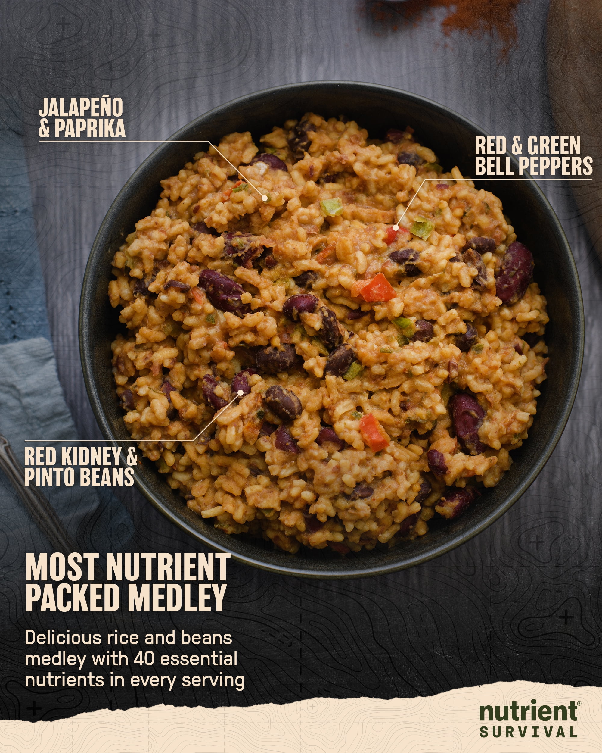 $37.66Nutrient Survival Southwestern Medley, Ready to Eat Freeze Dried Prepper Supplies What is Survival Food? Survival Foods are ready to eat food items or MREs (Meal, Ready-to-Eat) which have been processed and freeze-dried to have a much longer shelf life. These products are used during times of crisis or while adventuring and exploring outdoors. Nutrient Survival survival food is made with a patented process that has achieved two of the most important elements of nutrition – how to pack in flavor and nutrients. Prep with Pride, Survive & Thrive Nothing prepares you for what’s to come like proper nutrition. Nutrient Survival chef-made ready to eat meals and snacks take you from just surviving to thriving.Our plant-based meals and snacks have no added flavors, colors or preservatives and have a long, stable shelf life. We provide you with special ops-grade nutrition so you can operate at your best. What’s special about Nutrient Survival Southwestern Medley? Our Nutrient Survival Southwestern Medley is a nutritiously dense meal that is loaded with vitamins and minerals. Six times more healthy ingredients than other survival meals. It includes 14 essential vitamins and 14 essential minerals including biotin, folate and riboflavin, calcium, phosphorus, 6g fiber and selenium. It also has 346mg Omega 3 and 789mg Omega 6. Our protein-packed freeze dried food is natural and healthy. Just 1 serving provides your body with the nutrients that help you thrive. Strong enough for U.S. Special Operations Forces, but made to power everyone who wants to feed their freedom with the most nutrient dense meals on the market. At home, in the office, or on the road, Nutrient Survival makes eating nutritiously easy in every situation. There’s no more room for excuses and dead calories. Just a healthier, stronger you.