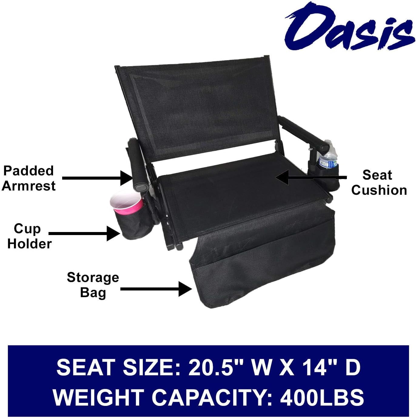 $77.54Oasis Big Daddy Super Heavy-Duty Stadium Seats The extra wide portable folding washable stadium bench seat is built for you to comfortably enjoy your seating experience at any sporting event that allows you to bring your own seat. The extra wide eliminates your back and rear end pain suffered while sitting on those hard, cold, and very uncomfortable aluminum or hard surface benches. After years of product development, this extra wide portable folding stadium bench seat has been approved by PITBA, pain in the buttock association. Features: – Lightweight – Heavy Duty – Compact – Foldable – Easy To Carry – Padded Armrests – Storage Pouch Specification – Seat Size: 20.5″ W x 14″ D – Back Side: 19″ H x 22.5″ W x 14″ D – Chair Weight: 9 Pounds – Weight Capacity: 400 Pounds Package Includes: – 1 Chair – 1 Seat Cushion – 2 Black Drink Holders – 1 Blanket Scroll up & click ‘ADD TO CART’ to get yours