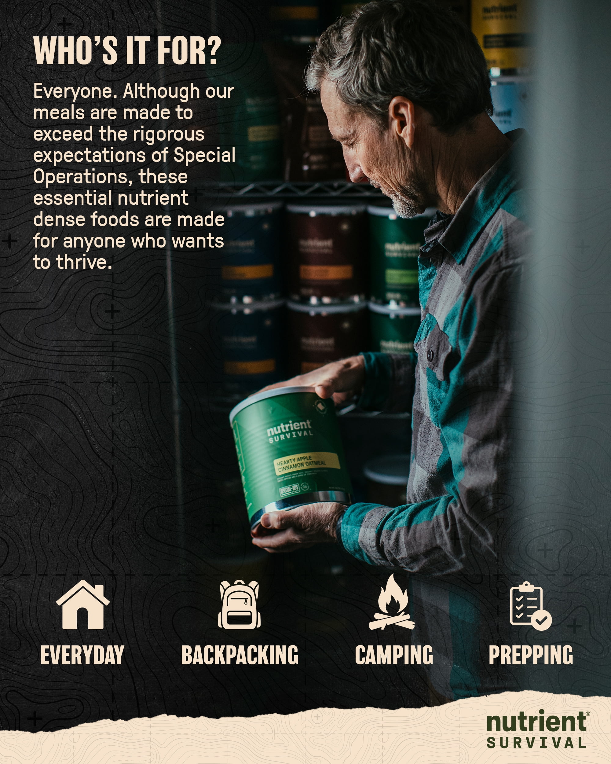 $30.09Nutrient Survival Hearty Apple Cinnamon Oatmeal, Freeze Dried Prepper Supplies & Emergency Food What is Survival Food? Survival Foods are ready to eat food items or MREs (Meal, Ready-to-Eat) which have been processed and freeze-dried to have a much longer shelf life. These products are used during times of crisis or while adventuring and exploring outdoors. Nutrient Survival freeze dried food is made with a patented process that has achieved two of the most important elements of nutrition – how to pack in flavor and nutrients. Prep with Pride, Survive & Thrive Nothing prepares you for what’s to come like proper nutrition. Nutrient Survival chef-made ready to eat meals and snacks take you from just surviving to thriving. Our plant-based meals and snacks have no added flavors, colors or preservatives and have a long, stable shelf life. We provide you with special ops-grade nutrition so you can operate at your best. What’s special about Nutrient Survival Hearty Apple Cinnamon Oatmeal? Our soy and gluten free oatmeal is an ideal nutritious breakfast food for anyone looking for an energy-packed meal. This creamy oatmeal provides a delicious and satisfying meal that is full of vitamins and minerals. Made with whole grain oats, organic golden quinoa, sweet apples and a dash of cinnamon. Our Hearty Oatmeal is natural and healthy. Just 1 serving provides your body with the nutrients that help you thrive. Strong enough for U.S. Special Operations Forces, but made to power everyone who wants to feed their freedom with the most nutrient dense meals on the market. At home, in the office, or on the road, Nutrient Survival makes eating nutritiously easy in every situation. There’s no more room for excuses and dead calories. Just a healthier, stronger you.