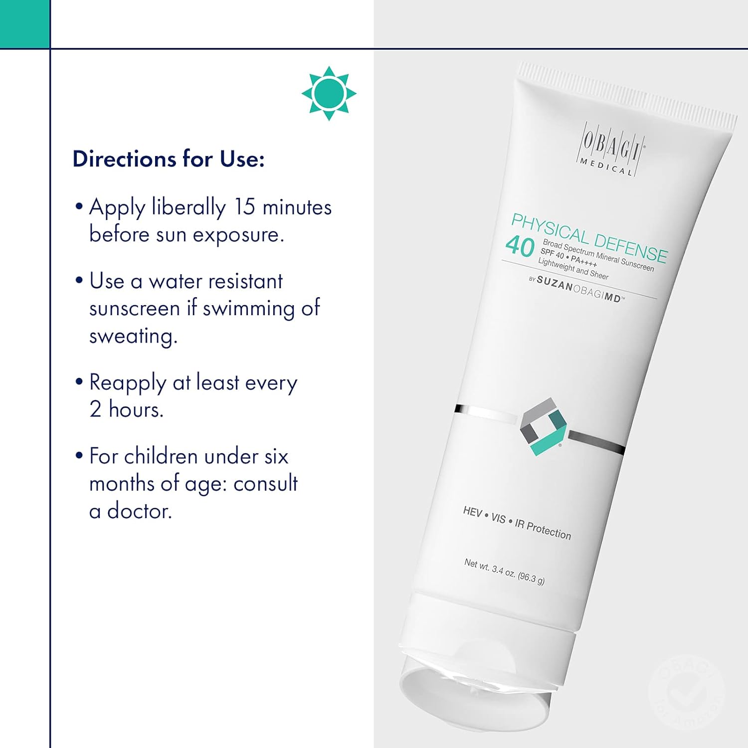 Obagi SUZANOBAGIMD Physical Defense Broad Spectrum SPF 40 Mineral Sunscreen, 3.4 oz