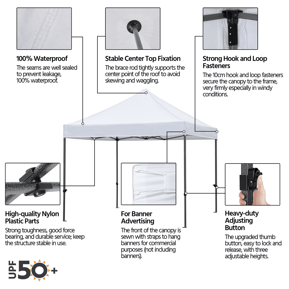 $116.95No matter it is rainy or sunny, you can always have fun with your friends under this waterproof heavy-duty commercial pop-up canopy! Let this pop-up canopy help you hold a perfect party or BBQ in the backyard, protecting from rain or ultraviolet. This commercial heavy-duty canopy is height adjustable for different needs. There are three holes for height adjustment on each tubular column of the pop-up canopy. The adjustable range is from 227cm/89.4inch to 245cm/96.5inch. You can freely change the height of the canopy according to your needs.The thoughtful details of the pop-up gazebo make it very convenient to set up and disassemble. Also, a wheeled carry bag is provided for easy storage and portability. The folding pop up tent is perfect for outdoor sports, festival events, flea markets, parties, etc. We are dedicated to providing you with sincere service. If you have any problems or questions in the use process, please feel free to contact us for further assistance.This commercial canopy is suitable for outdoor activities, camping, wedding, picnic, BBQ, and other commercial uses. The foldable design makes the tent easy to use and pack.