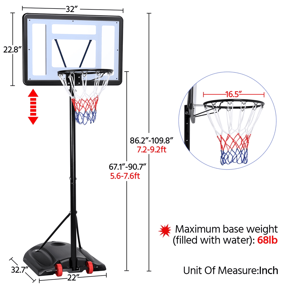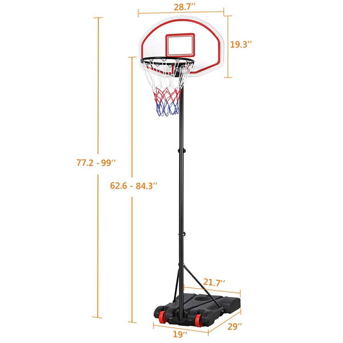 $68.95*Specifications: Materials: iron, PE plastic, synthetic fiber Overall dimension: 73 x 73.5 x (196-251) cm / 2.4 x 2.4 x (6.4-8.2) ft (LxWxH) Adjustable height between rim and ground: 159-214 cm/ 5-7ft Backboard size: 73 x 49 x 1.6 cm/ 28.7 x 19.3 x 0.6″(LxWxThickness) Basketball rim diameter: 42 cm/ 16.5″ Base size: 73.5 x 55 x 13.5 cm/ 29 x 21.7 x 5.3″(LxWxH) Wheel diameter: 10 x 3 cm / 4 x 1.2″(Dia.xH) Maximum base weight (filled with water): 33kg / 73 lb N.W.: 8.1 kg / 17.7 lb G.W.: 9.5 kg / 20.8 lb Color: Red Please Note: 1. For added safety, ensure to fill the base with water or sand before use. 2. To avoid the basketball stand tipping over and causing personal injury, please do not dunk.