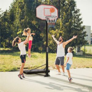 $61.91Turn your backyard into a playground filled with laughter and memories with the SmileMart portable basketball system. It has a big weighted base that can be filled with water or sand for added stability and safety, and the two wheels ensure good mobility of the stand. Featuring 6 pairs of holes for height adjustments, the telescoping post can be easily adjusted from 217 cm/7′ to 277 cm/9′ in 12 cm/4.7″ increments. It is constructed of high-impact polyethylene plastic backboard and base, and a powder-coated metal stand, our water, and weather-resistant basketball hoop are designed to withstand the elements. The base is equipped with two 4″/10 cm big wheels for effortless moving even when the base is weighted by stuffing.