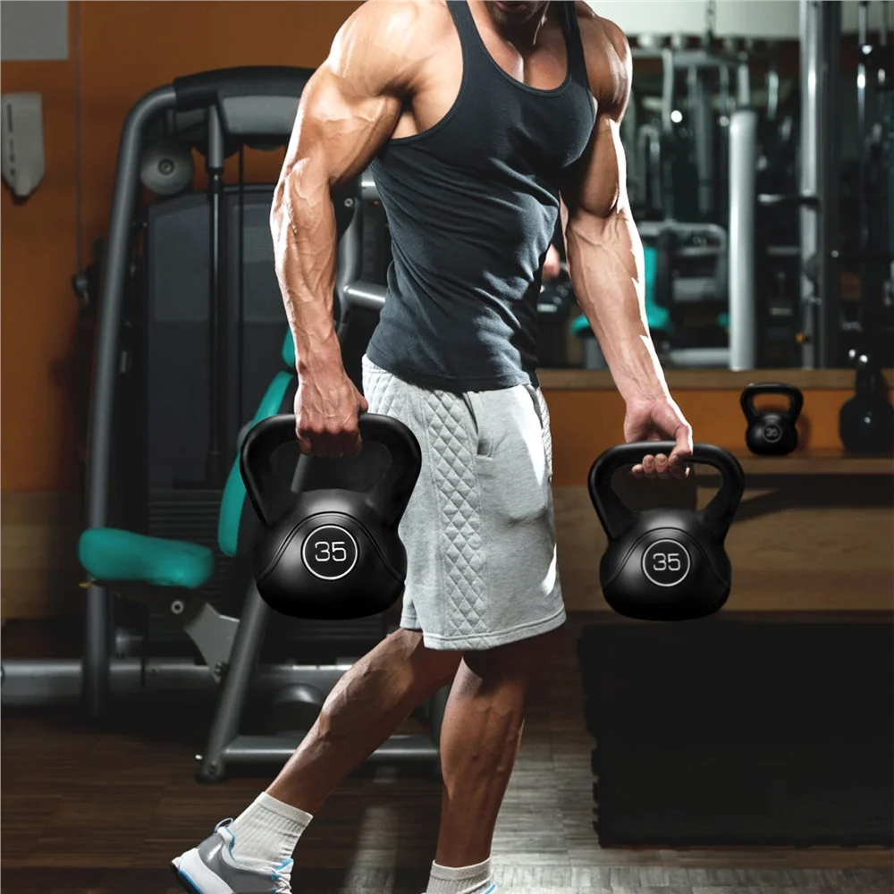 $39.11The kettle bells are made of durable HDPE hard shell and cement filling, this 35lbs kettlebell is a cost-effective alternative to the traditional cast iron kettlebells. The HDPE coating protects your floors especially when dropped accidentally. The wide grip allows you to comfortably hold the weight with one or two hands, and swing it conveniently and safely.