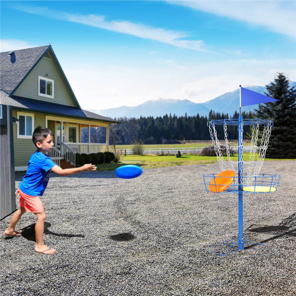 $64.49This solid basket contains 12 strands of heavy-duty chain for better catching, welded joints, and a big base frame to strengthen the stability of this basket. Comes with 3 ground stakes for double stability, no need to worry about tipping over by the hit from the disc or wind. Built in a lightweight and collapsible structure, convenient to move and transport, can be simply disassembled into a flat and compact size when not in use. Our disc golf basket is constructed of a powder-coated metal frame and galvanized chains. The excellent rust and weather resistance gives this flying disc basket the ability to withstand the elements, making it an ideal disc sports accessory for the outdoors.