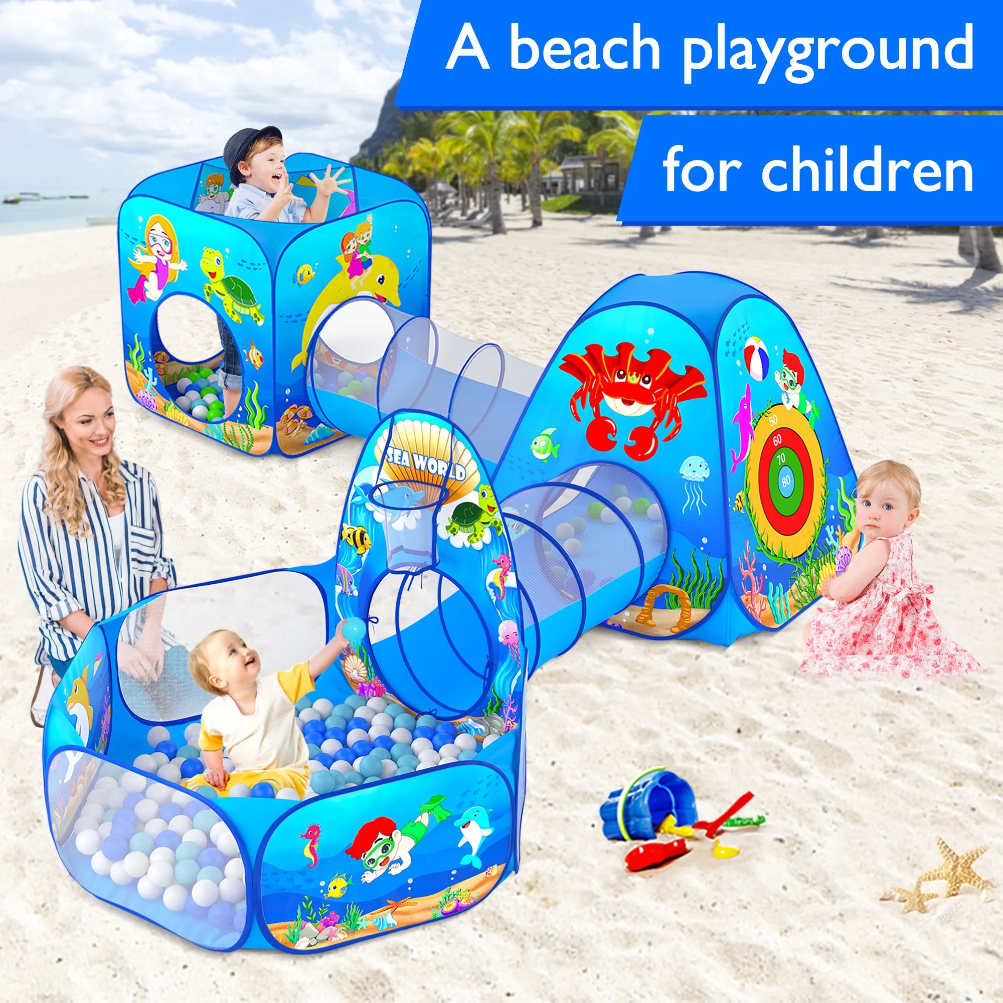 $35.25This 5 in 1 Kids game tent (Include 1 Baby Ball Pit, 2 Kids Play Tunnels, 2 Pop up Tents) will give your children entertained for hours! Cute Stone ball pit tunnels for toddlers are crafted after the pattern of several animals such as turtle, octopus, crab, whale, jellyfish, seaweeds, tiger among others. Navigating this pop up tent give kids a fantastic feeling of having an adventure in an animal kingdom.Fuel their imagination as kids crawl, swim and adventure through the open sea alongside vibrant friendly faces and sea creatures! (Balls not included)