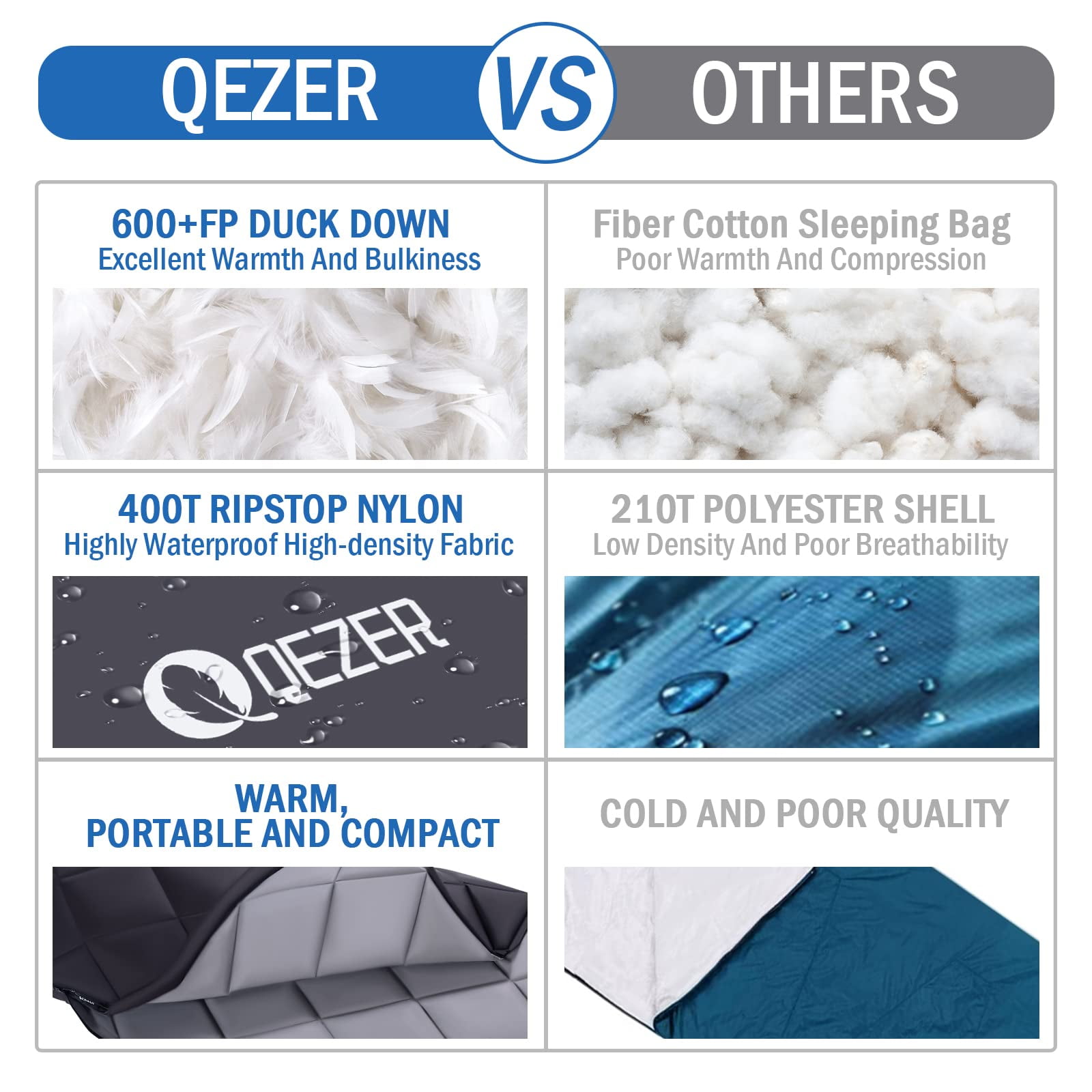 QEZER Ultralight Down Sleeping Bag for Adults 37-59 Degree F with Compression Sack for Backpacking, Hiking and Camping (Blue)