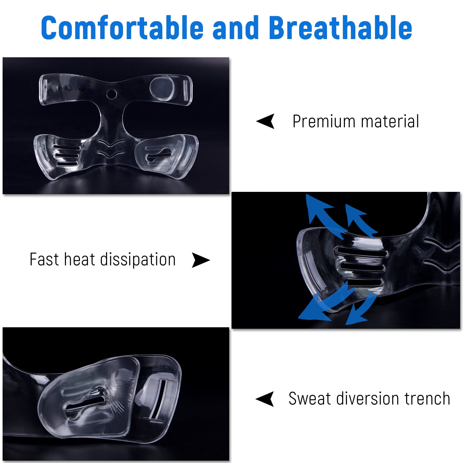 $32.67We have partnered with a large group of professional top athletes and sports therapists to provide them with a range of sports protective equipment that allows athletes to recover faster, prevent injuries and improve athletic performance during training and competition. All products are rigorously developed and tested. Qiancheng L5-S Clear Nose Guard:Designed for children and teenagers. Crack-proof and shatter-proof nose protector with adjustable safety belt and soft silicone pads to make the nose protector fit your face better, with non-slip cushioning. Breathable even when you sweat. You will not feel the weight of the nose guard when you wear it on your face. Put it in the carrying bag, use it anytime and anywhere, and wash it with water after use. Qiancheng nose mask helps to protect your face from Nasal, brow bone, orbital, cheekbones, zygomatic, maxillary injuries. Used as a post-operative nose protector or a broken nose or fracture protector. Perfect for basketball, football, volleyball, soccer ball, baseball, water polo, cheerleading and any other sports that can cause facial injuries. A variety of sizes to meet different ages/face shapes and fit your face better.