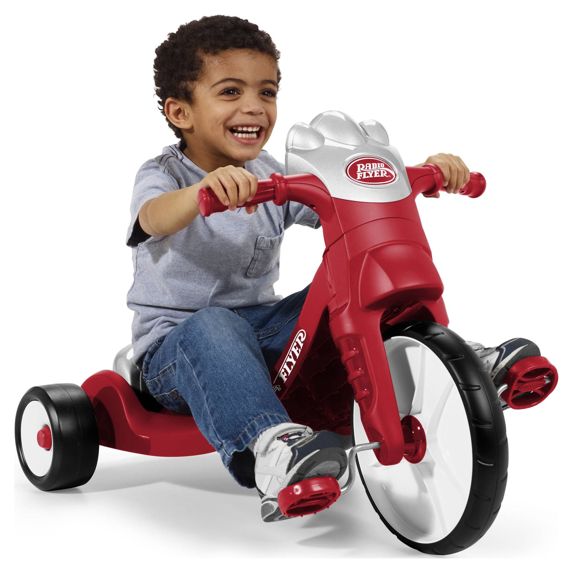 $42.97The Lights & Sounds Racer by Radio Flyer offers fun, fast riding with lights and sounds at a great price! This tricycle’s over-sized front wheel features traction tread material to hug the road and allow your child to take off without fear of slipping or spinning out. It also has working turn signal lights for even more imaginative, automotive fun and play. Additionally, the tricycle houses an electronic panel with 7 buttons with 9 different fun songs and sounds. Your little one is guaranteed to drive in style! This sturdy plastic trike has a comfortable, low-back seat that is adjustable to grow with your child. Unisex, for ages 2-5 years. 3 AAA batteries included.