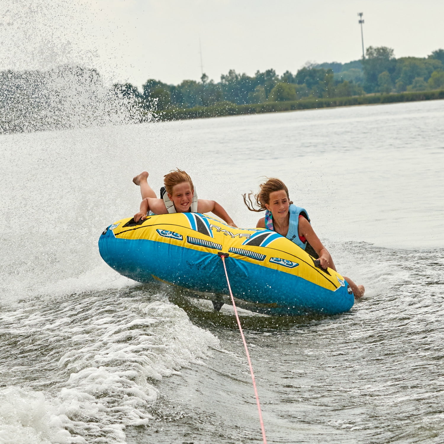$85.93The Fastrax dual donut style tow tube features a Skim-Fast™™ bottom that provides a slick and fast ride making it easy to plane and skim across the wake, four handles, and a quick connect tow point. We added extra excitement with the RAVE Tail™ that shoots water high into the air and alerts other boaters that tubers are under way!