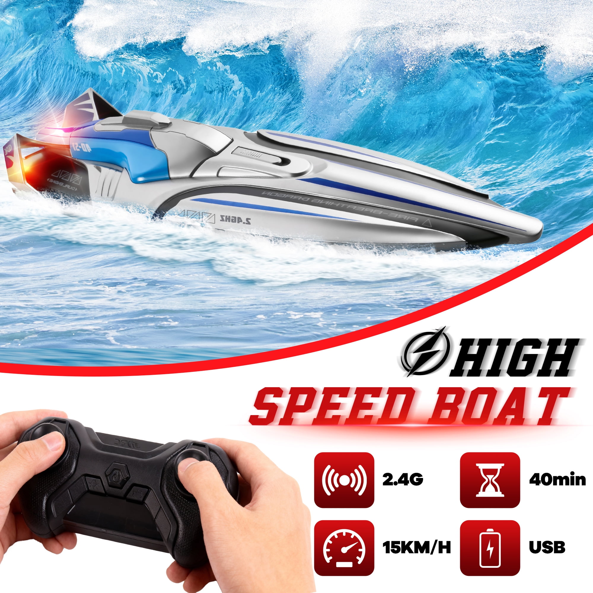 Remote Control Boat, 15KM/H Fast RC Boat with 2 Rechargeable Batteries, Pool Toys Water Toys for Boys & Girls