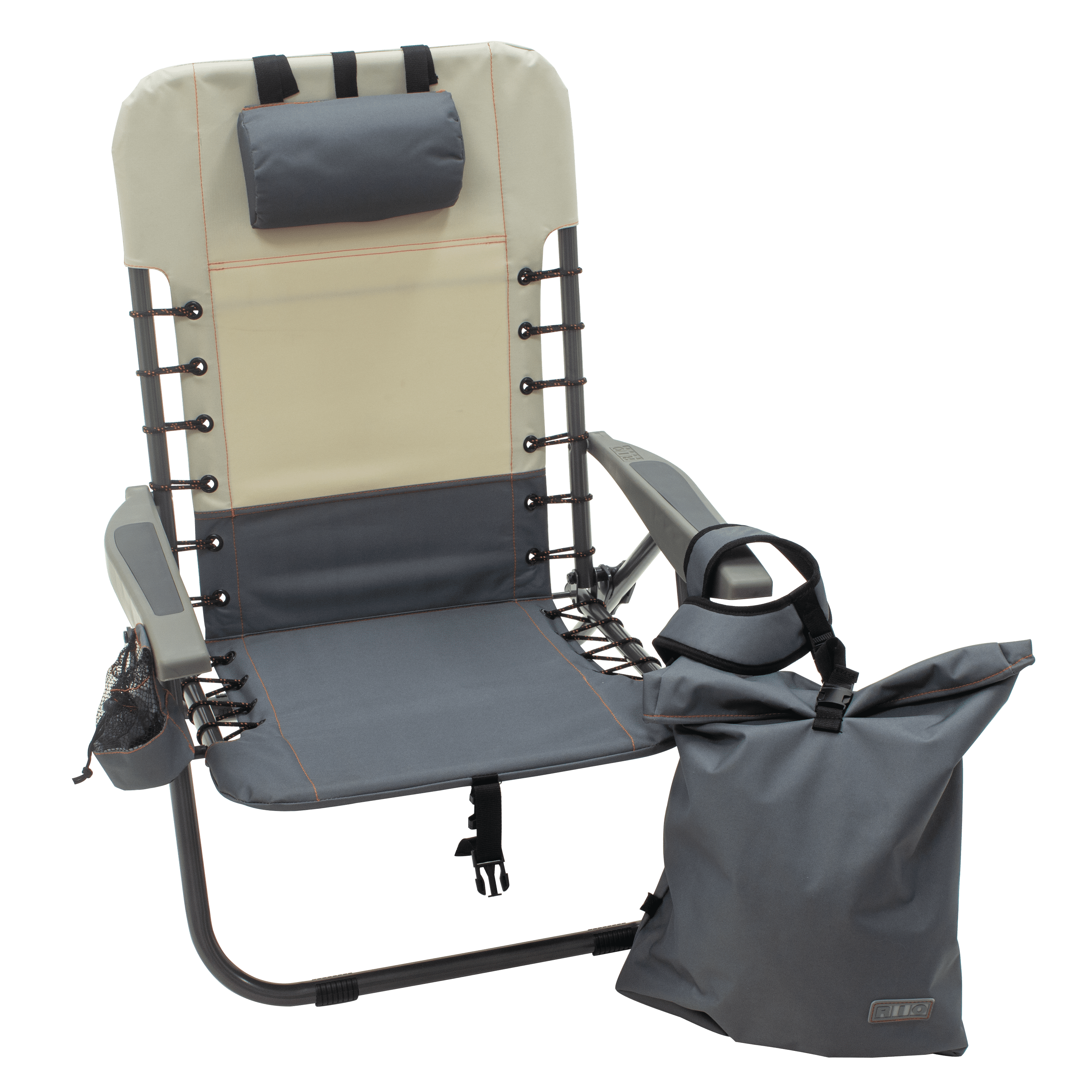 $77.38New Rio Gear 4-Position Lace-up Suspension Backpack 11″ Camping Chair in Slate/Putty Have a comfortable seat outdoors with a compact, portable Lace-Up Removable Backpack Chair. This stylish backpack chair is built for strength and convenience. You can wear it like a backpack: It has adjustable padded straps and a large, removable backpack for carrying your gear. The lace-up suspension on this backpack chair provides style and comfort, and a large adjustable foam pillow provides extra support when you’re on the go. There’s also a built-in cup holder attached to one of the comfortable molded arms. The powder coated steel frame resists rust and scratches. Features Dark powder coated steel frame with lace-up suspension Pillow head rest, cup holder, and molded arms Adjustable padded backpack straps and removable backpack Weight capacity: 250 lbs.