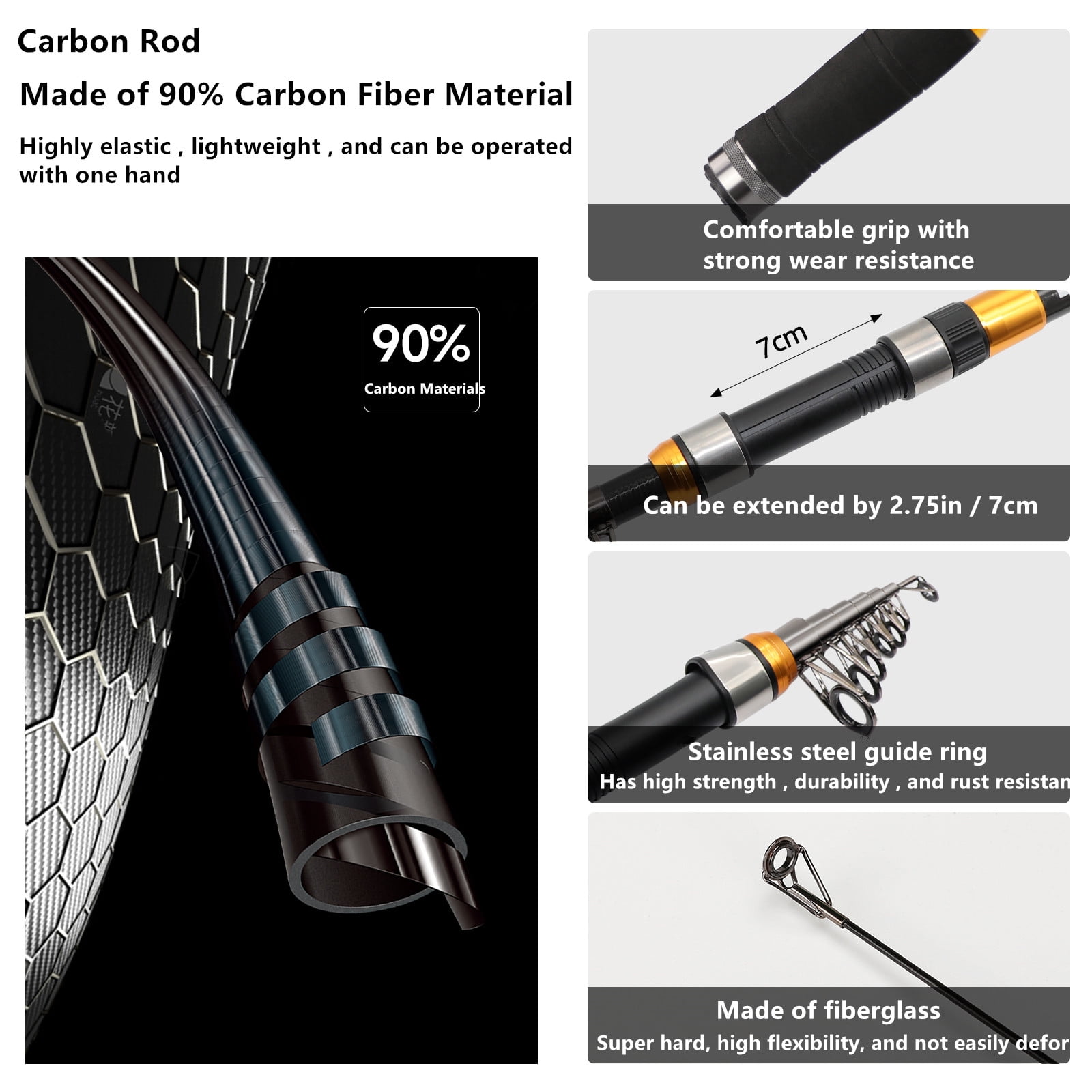 $42.13Carbon Fiber Fishing Pole and Reel Combo 1. Telescopic design, fishing rod will very compact, easy to carry and travel; 2. Stainless steel line guide with ceramic rings construction provides excellent casting distance and precision with better heat dissipation; 3. Exquisite spinning fishing reel, 13+1 smooth ball bearings, which reduce noice and balance operation. Model: HA 3000; Gear ratio: 5.2:1; 4. Large fish line capacity can effectively prevent fishes from escaping. The appropriate line diameter is affected by the current is small, also can effectively increase the sensitivity of the line in the water. Line capacity: mm/M 0.20/240 0.25/200 0.30/140; 5. NOTICE: After fishing, please gently wipe the rod with a towel that has been wrung out with water, and then wipe off the stains from each part. Telescopic Fishing Rod 1. The telescopic fishing pole is made of high-density carbon fiber, stainless steel refined hooded reel seat, strong and durable, corrosion resistant; 2. Stainless steel line guide with ceramic rings construction provides excellent casting distance and precision with better heat dissipation; 3. 5 different sizes of fishing rods for your choice: 5.9ft, 6.9ft, 7.9ft, 8.9ft, 9.8ft. Smooth Fishing Reel 1. 13+1 smooth ball bearings, low frictional resistance when fishing, smooth rotation, faster reeling; 2. Forward and reverse locking buckle; 3. Interchangeable right or left hand foldable metal handle; 4. Model: HA3000; Gear ratio: 5.2:1; Line capacity: mm/M 0.20/240 0.25/200 0.30/140. A Variety of Fishing Lure Accessories 1. Our fishing lure set includes 22 piece tackle kit with a variety of realistic bass bait lures, fishing snap, offset worm hook, curved tail grubs, thread bullet copper and fishing lines to meet your various needs; 2. Large fish line capacity can effectively prevent fishes from escaping. The appropriate line diameter is affected by the current is small, also can effectively increase the sensitivity of the line in the water. Line capacity: mm/M 0.20/240 0.25/200 0.30/140.