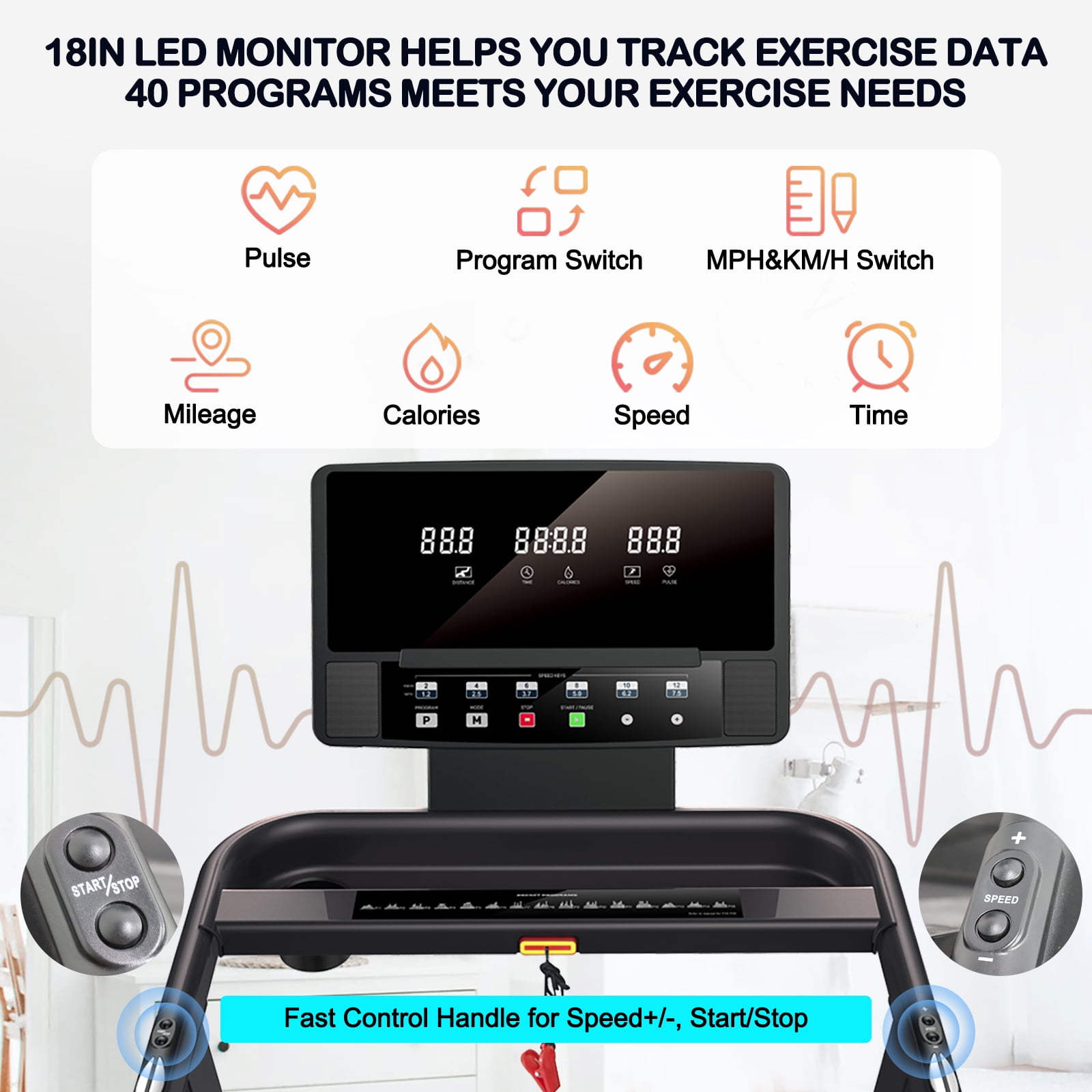 $601.14Original price was: $601.14.$515.91Current price is: $515.91.RUNOW 2.5HP Electric Exercise Treadmills Support 0.6-8.1MPH, 300LBS Capacity Folding Treadmill with 40 Programs, 18IN LED Monitor, Bluetooth Speaker and 3-levle Manual Incline, Treadmills with 49.2 X 16.5IN Large Running Belt for Home & Office Description: RUNOW treadmill has a 2.5 HP powerful and quiet motor designed specifically for home and office use. Its maximum speed can reach 8.1 Miles per hour. The treadmill for home can be folded up for small-footprint storage, and it folds up quickly and safely without any tools. With hydraulic rod mechanism, only one gentle kick, the treadmill would lower to the ground slowly and safely. Top quality 16.5 inch wide grass patterned belt provides optimum tread while offering enough space to walk, jog and run comfortably. Feature: 2.5HP POWERFUL & QUIET MOTOR supports speed adjustment from 0.6-8.1MPH. 7-LAYER ELASTIC CUSHIONING BELT and Built-in SHOCK-ABSORBING SYSTEM protect your joint. 40 CUSTOMIZED PROGRAMS to meet various fitness goals. Built-in BLUETOOTH SPEAKER for an enjoyable workout experience. 3-LEVEL MANUAL INCLINE adjustment for added intensity. 18IN LED DISPLAY tracks your exercise data at any time. TWO TRANSPORT WHEELS and FOLDABLE DESIGN for easy storage. Specification: Material: Alloy Steel, Plastic Unfold Size: 60.4 * 26.6 * 55.9in (L x W x H) Folded Size: 37.6 * 26.6 * 55.9in (L x W x H) Running Area: 16.5″*49.2″ Net Weight: 110 lbs Weigh Capacity: 300 lbs Speed: 0.6-8.1MPH Incline Levels: 0-5% Speaker: 2 Maximum Horsepower: 2.5 Horsepower Screen Size: 18 Inches Display Type: LCD Deck Length: 49.2 Inches Deck Width: 16.5 Inches Power Source: Electric Package List:RUNOW Treadmill, User Manual, Safety Key, Power Cord, Tool Kit, Lubricant