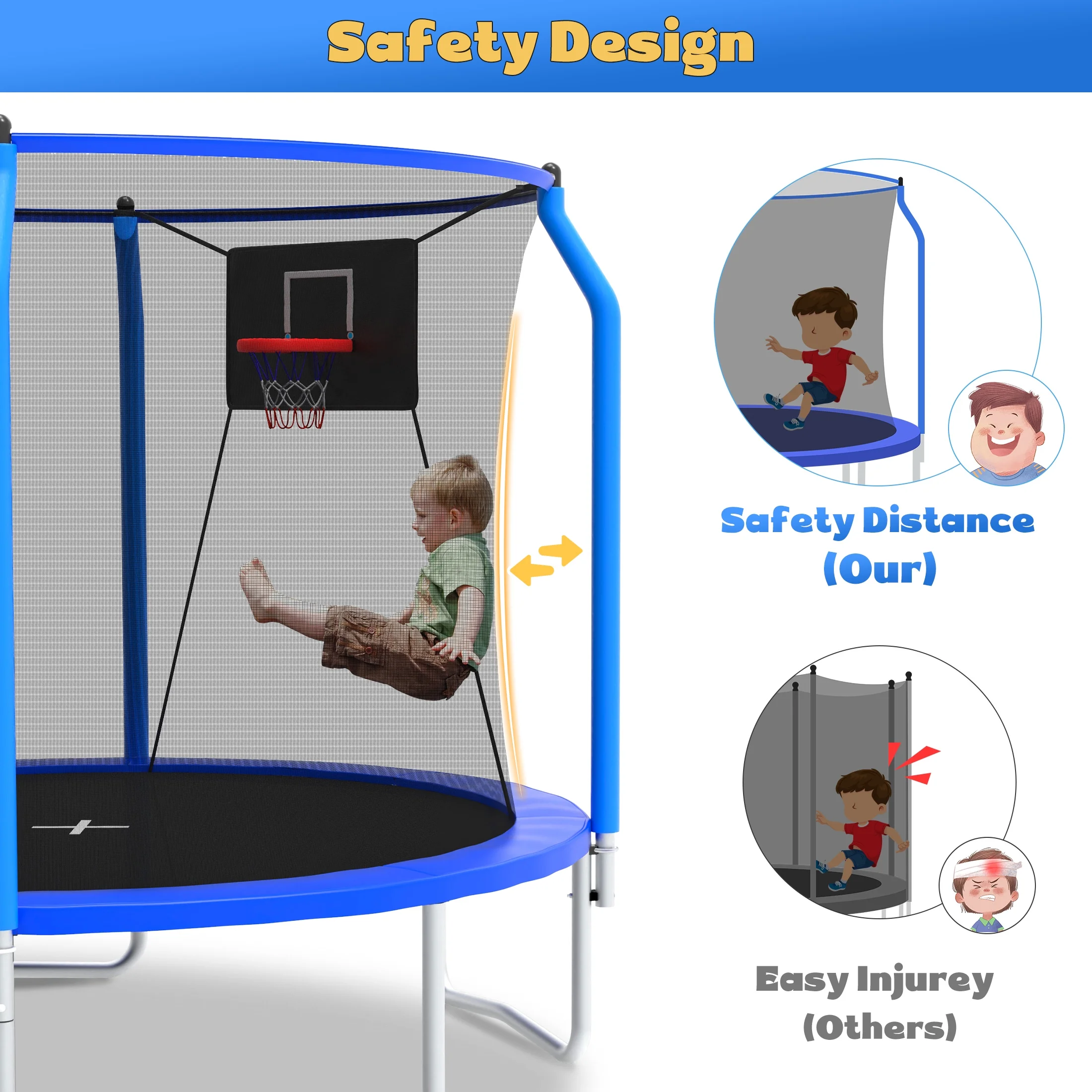 $266.59Original price was: $266.59.$100.61Current price is: $100.61.Kids young and old will love the trampoline! The 10′ round trampoline with enclosure is the perfect addition to any backyard! This traditional round trampoline is a great fit for growing children because it gives them plenty of jumping space while still providing a great bounce. This trampoline also features a no-gap enclosure system that interlocks the jump mat and enclosure net at each spring, eliminating dangerous gaps. The framework is made of weather and rust-resistant steel, providing extra protection for years to come. The 10′ round trampoline with basketball hoop will provide hours of fun for the whole family, and create lasting memories you will not forget! ???How to install a trampoline Click Here ?BEST GIFT FOR KIDS? The trampoline can accommodate several kids simultaneously. This is a good place for children to make friends, and it will attract many children to come and play. Which will become a playground for children and parents can spend a happy time with them. It is definitely the best Birthday/Children’s Day gift for kids. ?LONG LIFESPAN? All SEGMART trampolines are safety and durability certified. High-quality UV-proof safety enclosures protect you from the sun and premature material fading for longer life. ?POWERFUL LOADING CAPACITY? Thanks to a heavy-duty galvanized steel frame, 4 U-legs, and galvanized springs, the trampoline is sturdy and can afford a 300lbs maximum weight limit. ?BASKETBALL HOOP TO CHOOSE? Best Gift for Kids. The basketball hoop is a great addition to the trampoline. It not only allows kids to play basketball while bouncing but also attracts kids to get closer to nature and enjoy a happy time with friends together. It is definitely the best Birthday/Children’s Day gift for kids. ?EASY TO ASSEMBLE BACKYARD TRAMPOLINE? SEGMART trampoline includes a steel frame, jumping mat, basketball hoop, safety enclosure, and ladder. It is easy to assemble. All parts including hardware are listed and numbered in the instruction. The specific assembly steps are shown in picture form which is easy for you to understand. ?CUSTOMER SERVICE? Please contact us without any hesitation if you have any problems with our products. If there is a problem with the product, we will actively deal with it. Features? -360� Enclosure net and no gap design provide a safe sports environment -Ladder and double-sided zipper help to quickly enter the trampoline -4 U-shaped support legs are evenly distributed for more stable construction Specification? -Main Color: Blue -Materials: UV-resistant PVC spring pad, Weather-resistant steel, polypropylene mat, polyethylene net -Assembled Product Dimensions:10’Lx10’Wx8.5’H -Max Weight Capacity: 600LBS Package Included One Trampoline Warm Tips: -There may be a chromatic aberration caused by light/monitor difference. -The size is manually measured, there may be reasonable errors. -Unless quality problems, we don’t provide return service! �